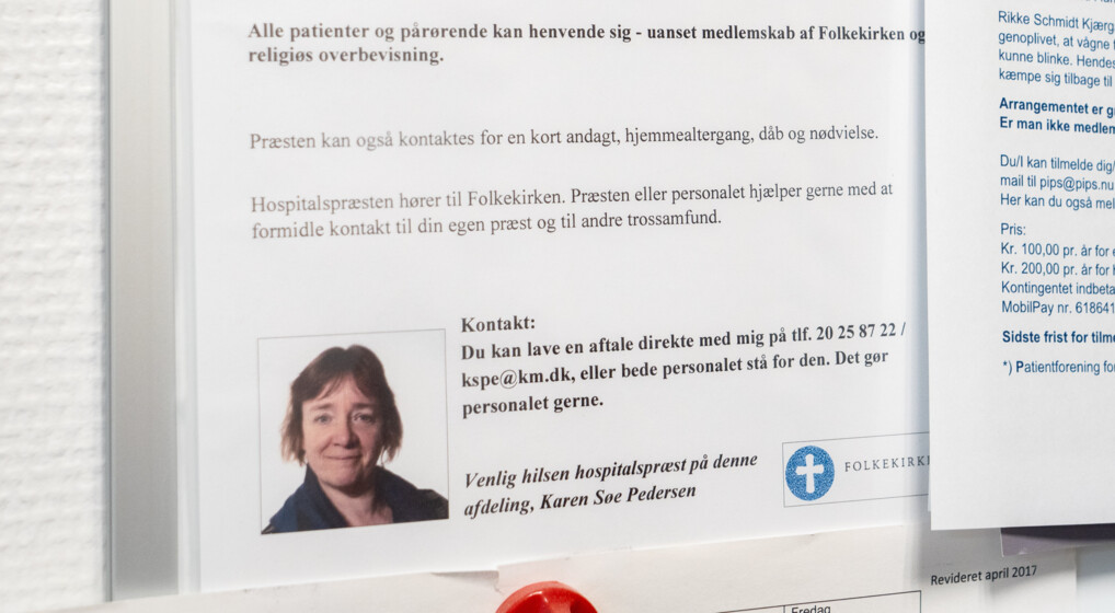 Patienter, pårørende og personale kan blandt andet altid finde kontaktoplysninger afdelingernes sygehuspræster på hospitalsstuerne. Foto: Anika Thorø Weber
