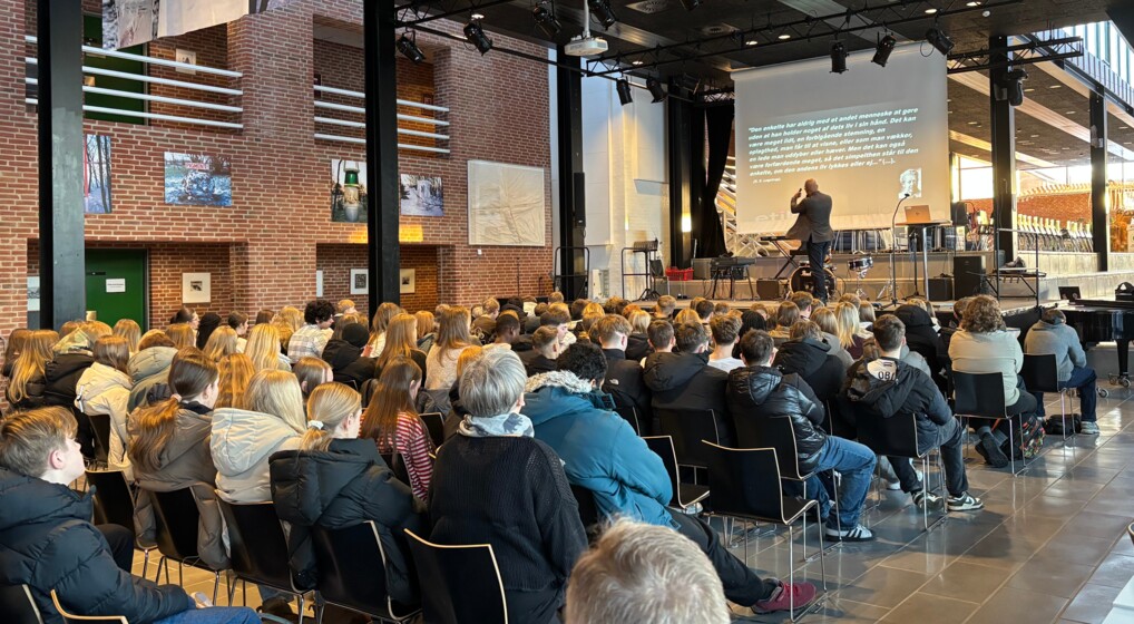 Gymnasiepræst Sofie Gjørup Winkel fortalte elever i 9. klasse om begrebet værdier, da Hvad er Meningen? blev afholdt på Fjerritslev Gymnasium 14. januar 2026. Foto: Anna Margrethe Dige Saxild