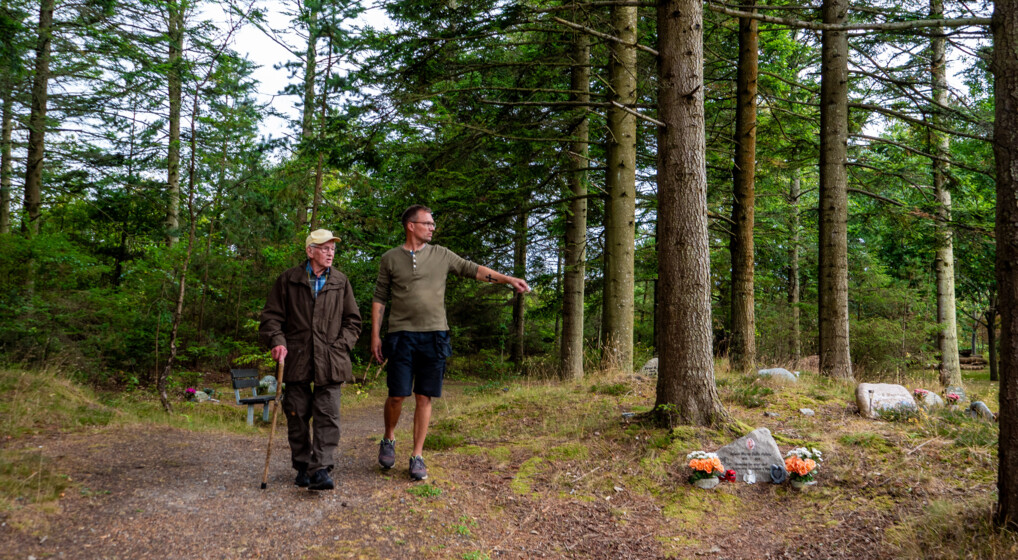 95-årige Johannes Skov med kirkegårdsmedhjælper Jesper Mikkelsen på Emmersbæk Kirkegård. Johannes Skov er tidligere kommunegartner og ved etableringen af kirkegården i 1973 var han en af dem, der ønskede, at naturen i videst muligt omfang skulle bevares. Foto: Anika Thorø Weber