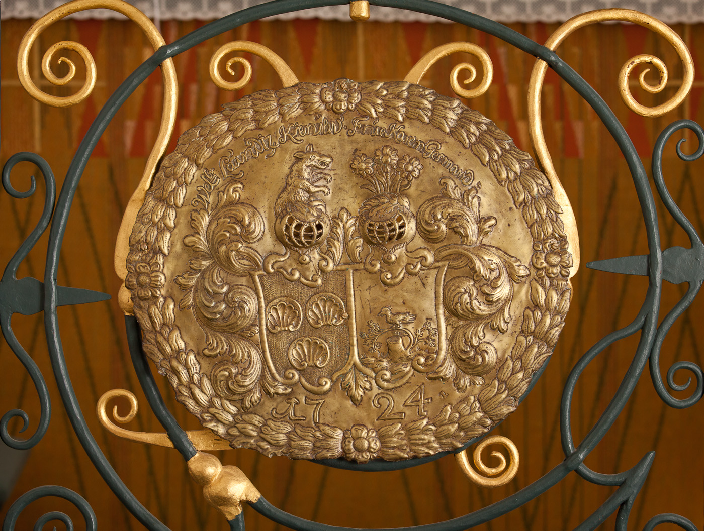 Alterskranken er skænket af Laurids Kierulff og hustru Karen Gesman, Wiffertsholm, i anledning af, at de blev optaget i adelstanden i 1724. På midterfeltet ses parrets våbenskjolde.