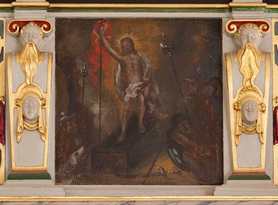 Topstykket har et gavlfelt med en engel. Fodspirene og topspiret stammer formentlig fra renoveringen i 1724. Motivet i topstykket er Opstandelsen. Billedet flankeres af to hermer. Topstykket har endvidere to vinger også med spir, ligesom der er to spir på hver side på storgesimsen.
