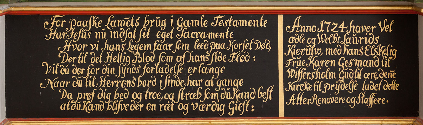 En indskrift på fodstykket fortæller: »Anno 1724 haver Velædle og Welbr. Laurids Kierulw, med hans Elskelig Frue Karen Gesmand til Wiffersholm Gud til ære, denne Kircke til Prydelse ladet dette Alter Renovere og Staffere.«