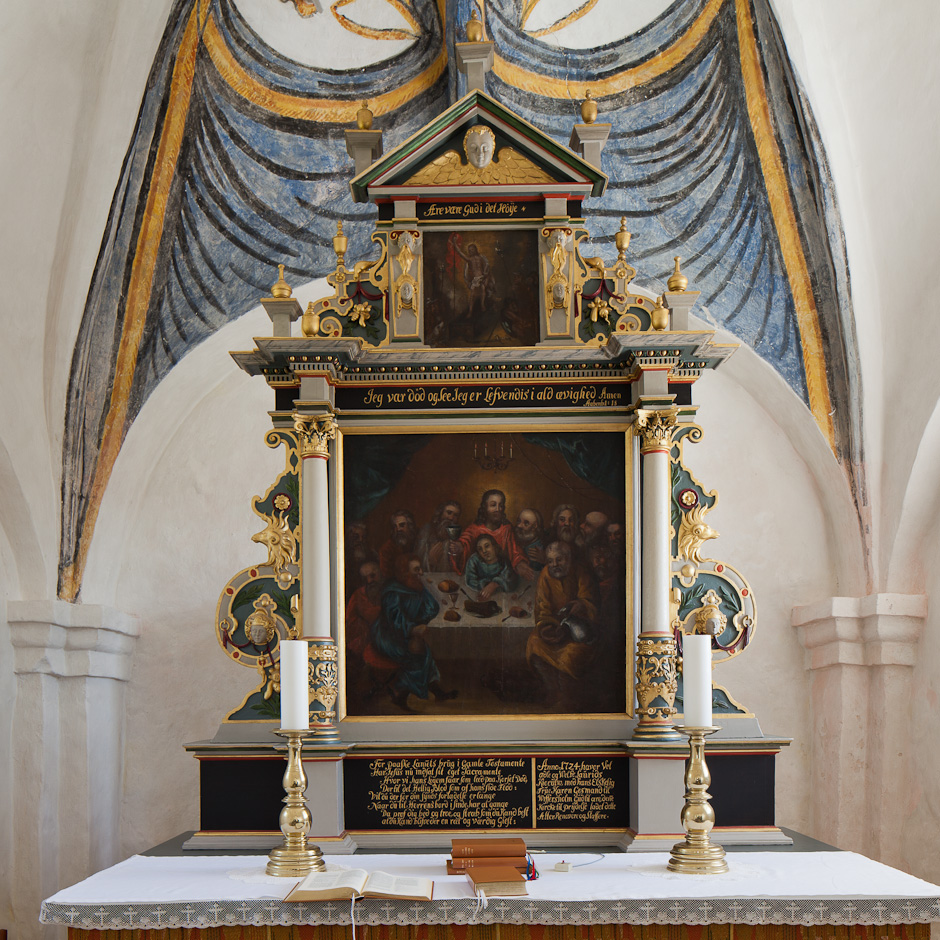 Altertavlen er fra 1597 med senere ændringer. En indskrift fortæller: »Anno Domini 1597 lod Erlige velbørdig Mand Jørgen Urne med hans Kjære Fraue Margrete Wifferts Giøre denne Tauffle til Guds og Kirkens Erre oc på Kirkens Bekostning.«