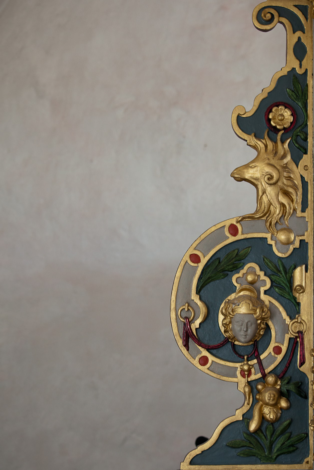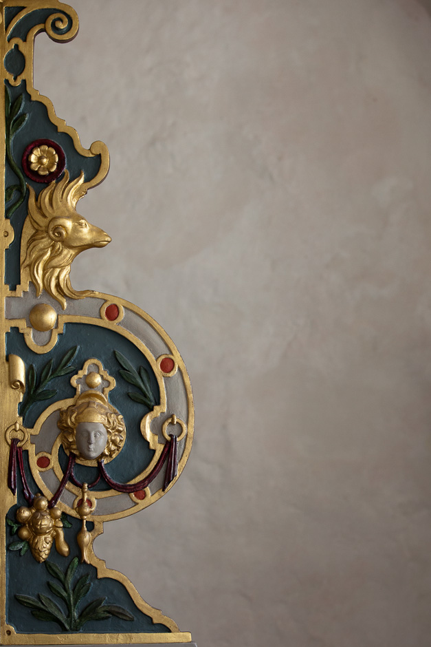 Hovedbilledet flankeres af to søjler med glatte skafter, korintiske kapitæler og prydbælter forneden. Også storstykket har vinger.