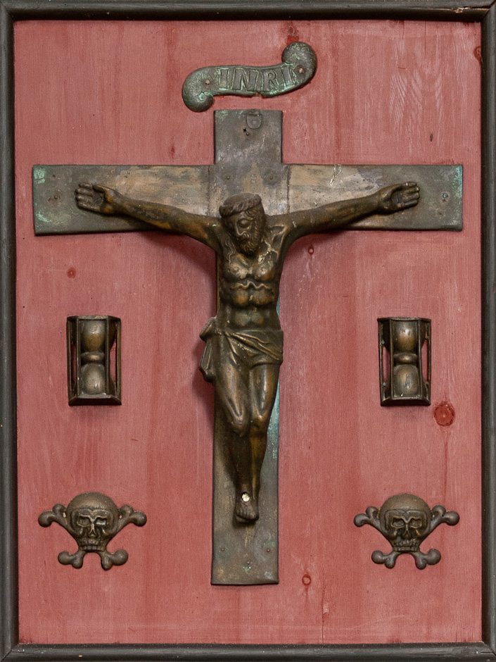 Nogle beslag og et krucifix er bevaret op monteret på en tavle, der hænger i koret over døren til sakristiet.
