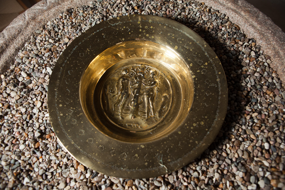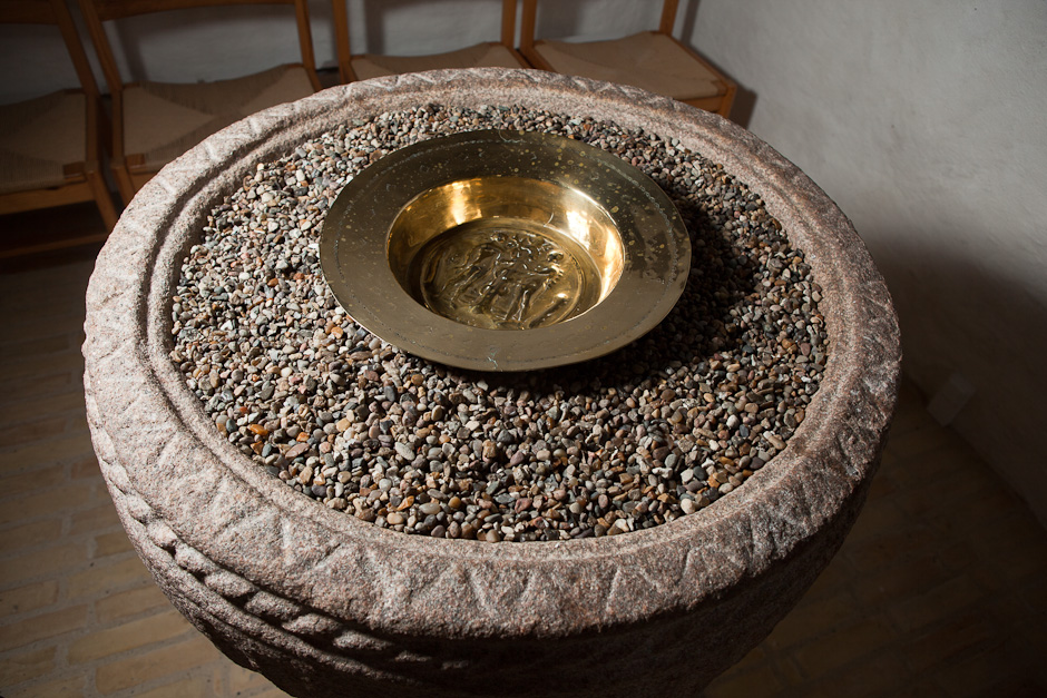 Den middelalderlige granitdøbefont er nært beslægtet med fontene i Tornby, Mosbjerg, Astrup, Tårs og Jelstrup. Se links under Astrup kirke. Denne gruppe fonte er karakteristisk ved de lodrette dobbelte eller som her tredobbelte stave, der deler kummen i en række felter.