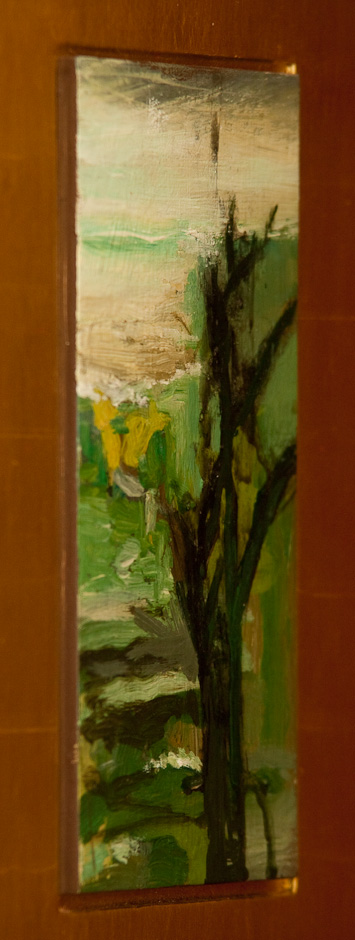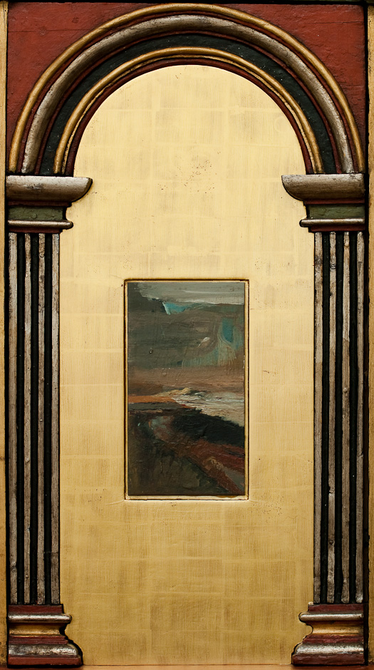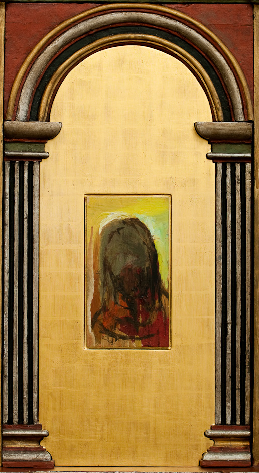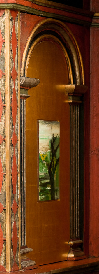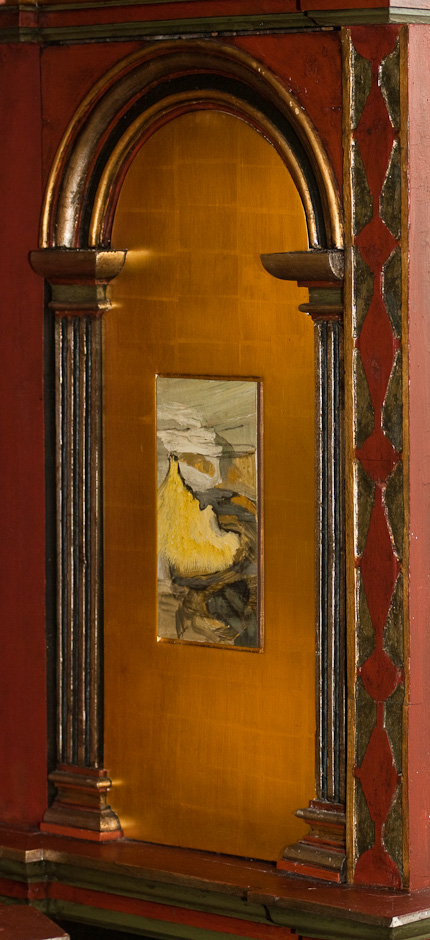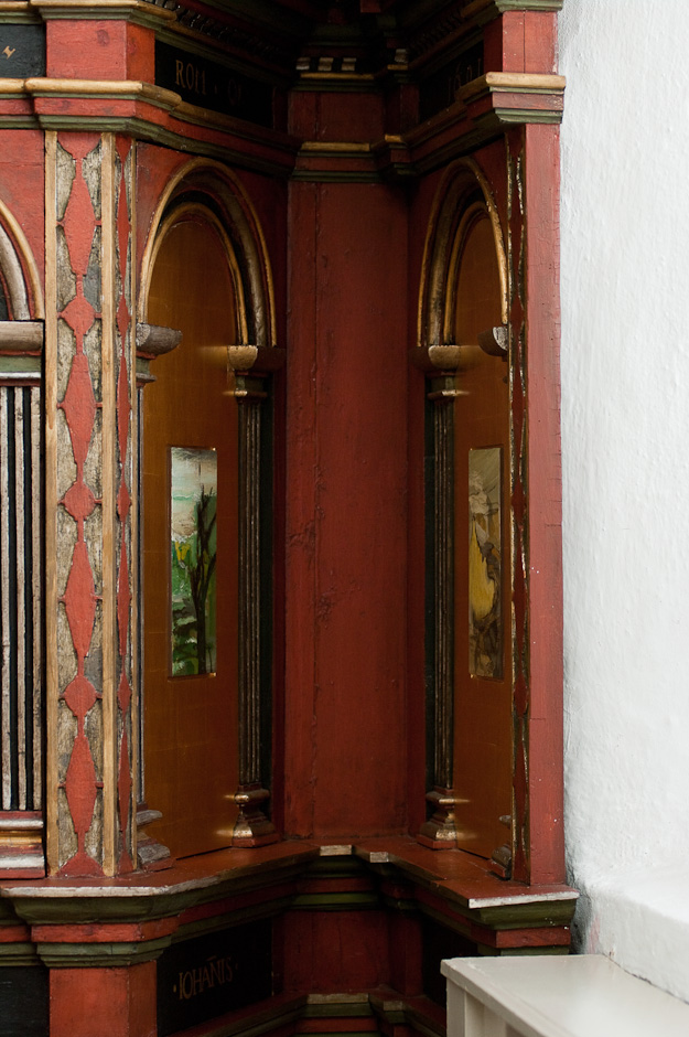 Maja Lisa Engelhardt udsmykkede prædikestolen i 2008. Hun valgte at male små billeder i storfelterne af hensyn til det lille rum. Baggrunden i storfelterne er belagt med bladguld.