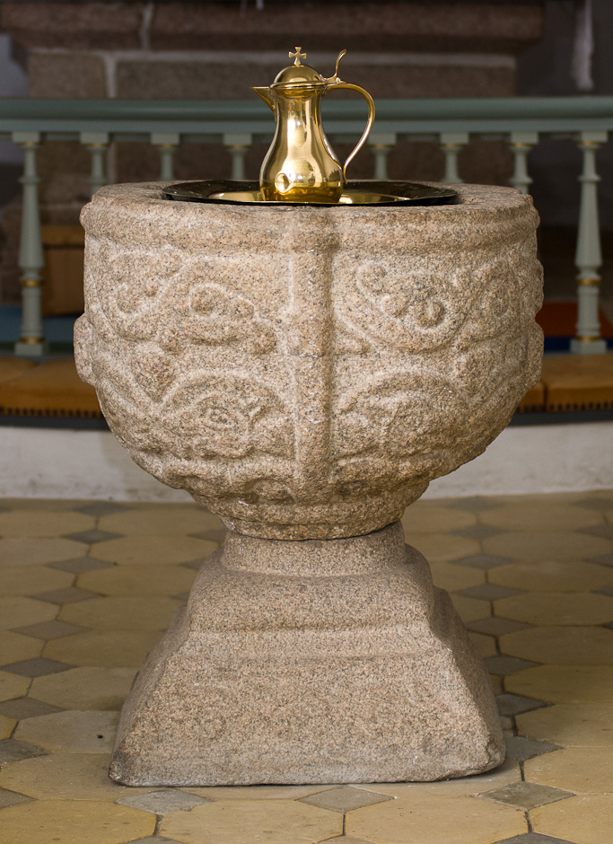Døbefonten ligner fonten i Sennels. På kummen har den fire lodrette rundstave. De to har en ring på midten, mens de to andre er udformede som små mandslinge med strækt fremtrædende mave og med hænderne i siden. Fra rundstavene udgår bladranker fra oven. Forneden ses dyrehoveder med små ører, mandelformede øjne og lange snuder. Over hvert hoved er der en flad rundbue og mellem dem et hjerte. Under hovederne er der i højt relief en række små rundbuer med en paddehatlignende figur inden i. De små rundbuer og de paddehatlignende figurer er gentaget på den ene side af den pyramidestubformede fod. De tre andre sider har bladranker som kummen, men de ender i dyrehoveder.