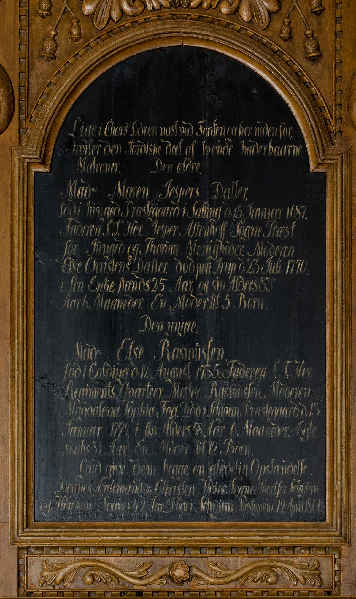 »Lige i Chors Døren næst ved Fonten og herneden for hviler den jordiske Del af tvende hæderbaarne Matroner, den ældre, Madm Maren Jespers Datter, fød i Junged Præstegaard i Salling d. 15. Januar 1687. Faderen s.t. Her Jesper Altenhoff, Sognepræst for Junged og Thorum Menigheder, Moderen Else Christens Datter; død på Irup d. 13. Juli 1770 i sin Enke Stands 25. Aar og sin Alders 83de Aar 6 Maaneder. En Moder til 5 Børn.