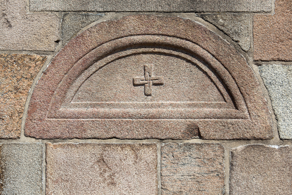Romansk gravsten med indridset kors er også indmuret i sydmuren.