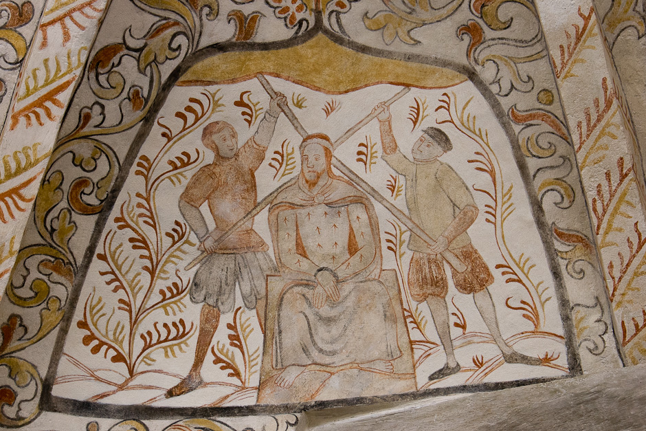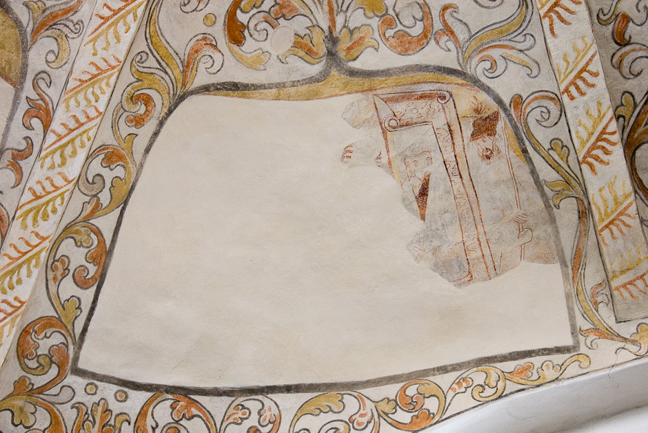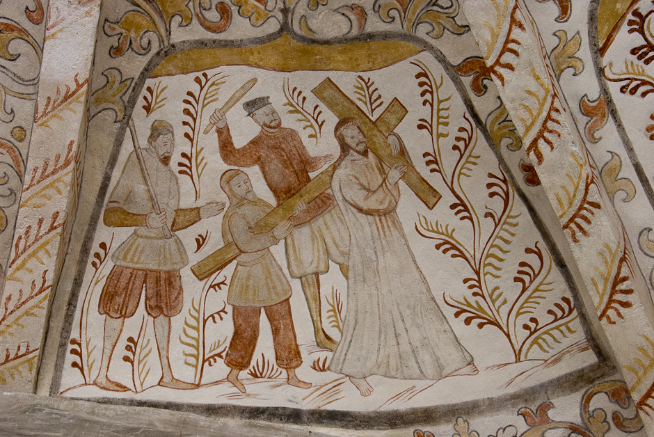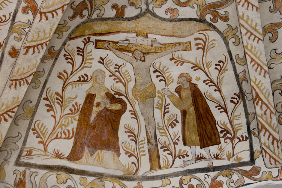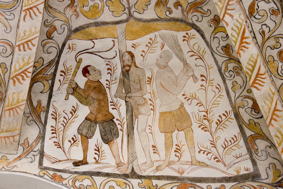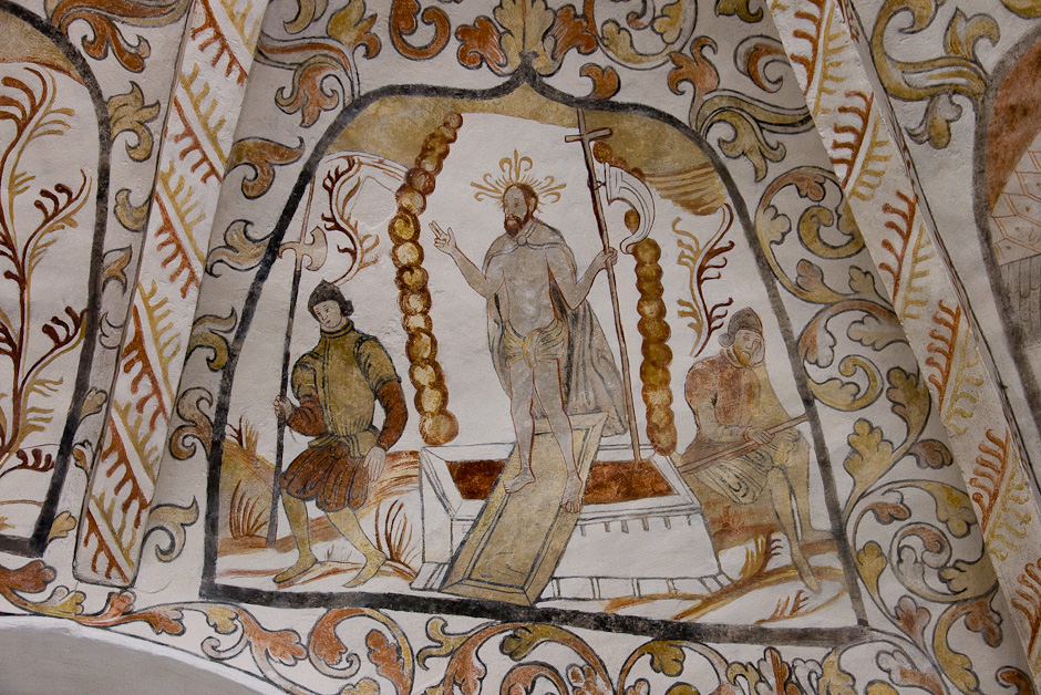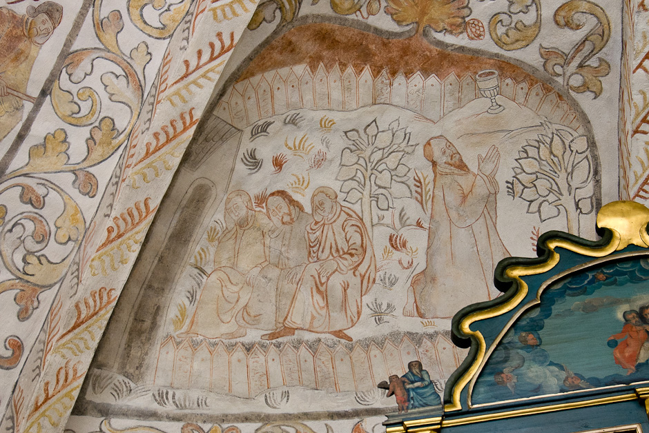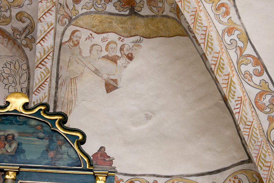 Kalkmalerierne blev fundet allerede i 1884, men først afdækket i 1917-19. De er fra 1550-60. Det er typisk for den tid, at billederne er rammet ind og omgivet af et tæt rankeværk. Krydshvælvet består af fire kapper, der er hver er delt i to. Serien begynder i østkappens nordlige felt og læses i urets retning.