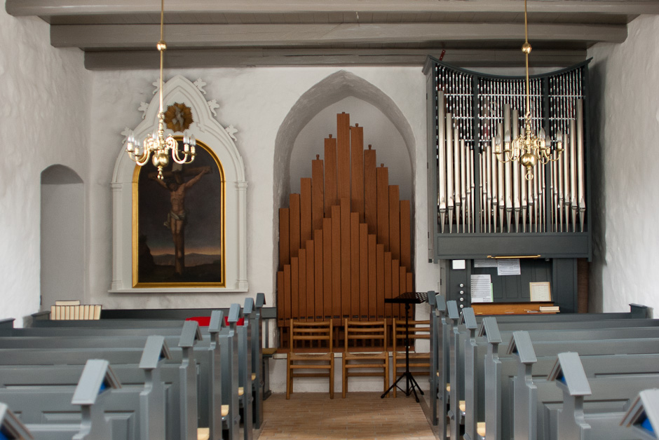 Ved den indvendige restaurering af kirken i 2002 fjernede man vægpaneler og forsynede bænkene med gavle ind mod væggene. De store træpiper til orglet står i den tilmurede åbning til tårnrummet.