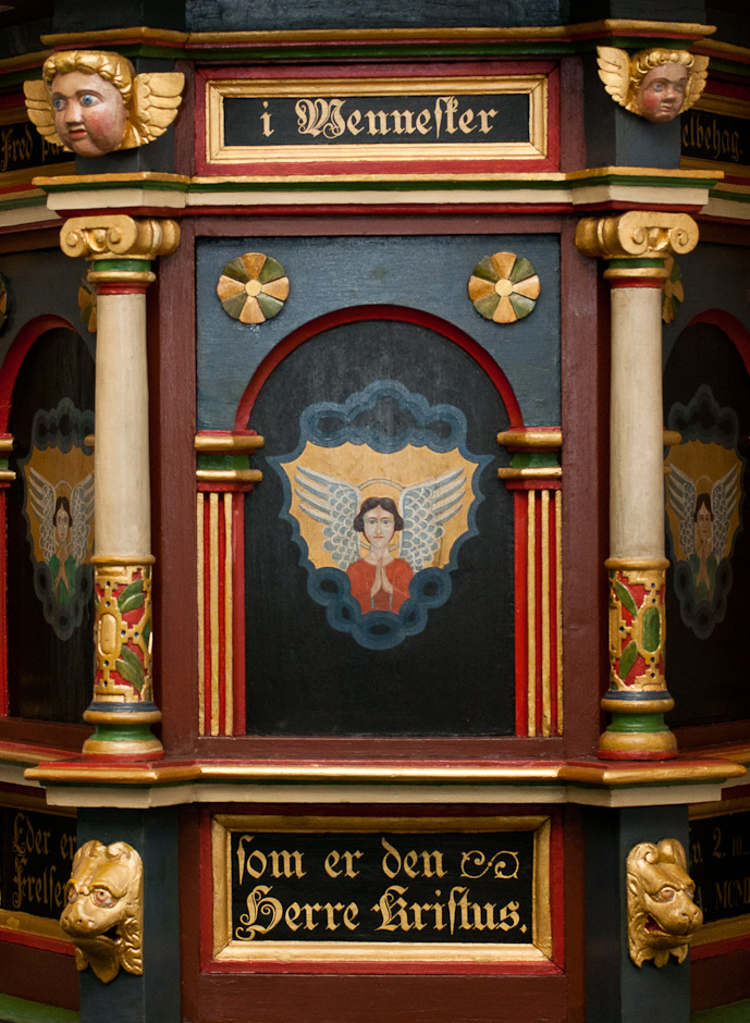 Prædikestolen er fra o. 1625. Storfelterne har bueslag og riflede pilastre med listekapitæler. På hjørnerne står der søjler med joniske kapitæler, glatte skafter og prydbælter. På fremspringene mellem smalfelterne for oven er der englehoveder og forneden løvehoveder. De ens englemotiver på storfelterne er af nyere dato. Det samme gælder stafferingen, teksten og nedhængene.