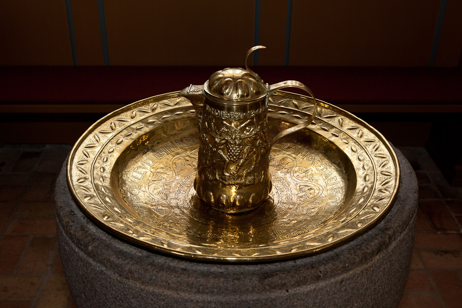 Dåbskanden er købt på en auktion i Aalborg i 1920. Motivet er spejderne, der vender tilbage til Moses fra det forjættede land med en vinklase så stor, at der skal to mænd til at bære den, som tegn på landets frugtbarhed. Se 4. Mos. 13,23.