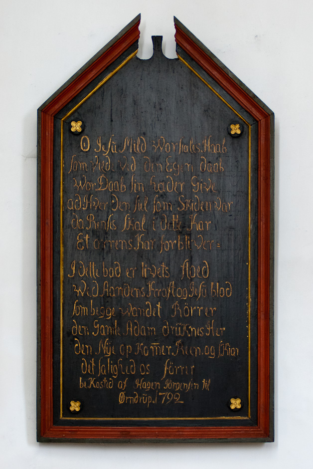 På væggen hænger en trætavle med et par vers om dåben. Den er »Bekosted af Hagen Jørgensen til Ørndrup 1792« Tavlen er dog fra o. 1700, så bekostningen må referere til en opmaling.