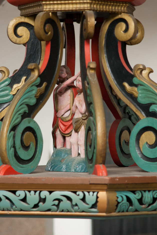 Fontehimlen fra o. 1700 er ottekantet. Bag volutterne med akantusblade Jesu Dåb.