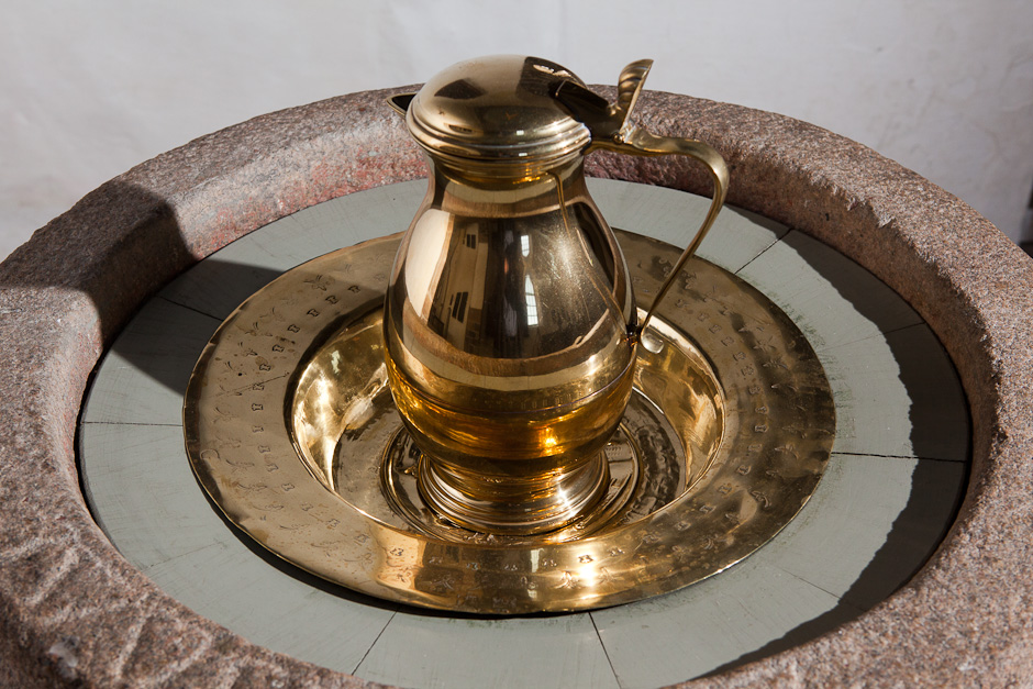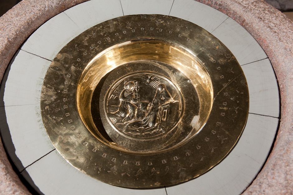 Dåbsfadet er fra Nürnberg o. 1575. Motivet i bunden af fadet er Mariæ Bebudelse.