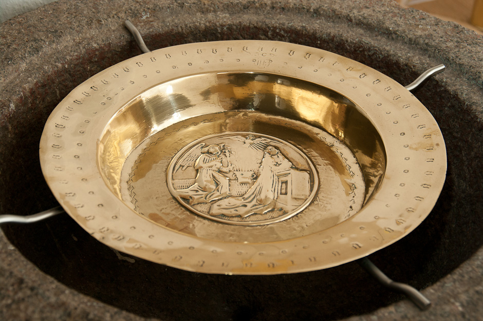 Fadet er et nürnbergarbejde fra o. 1575. Motivet er Mariæ Bebudelse.