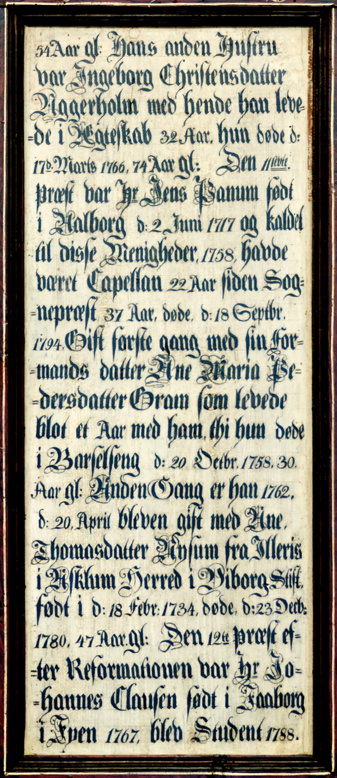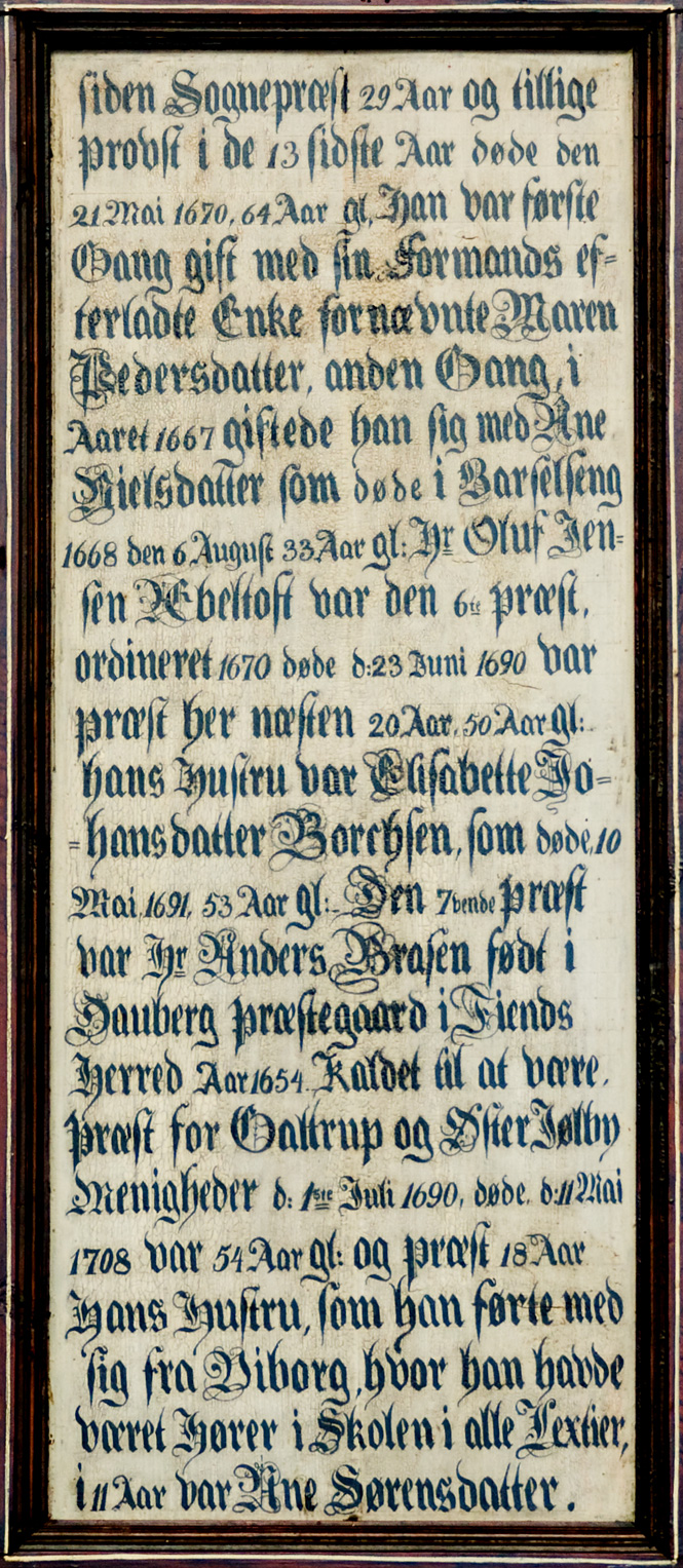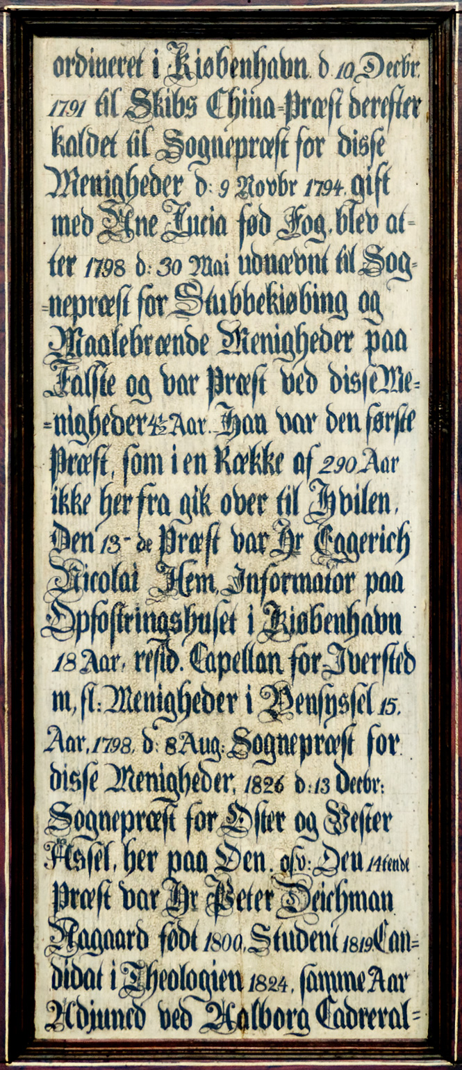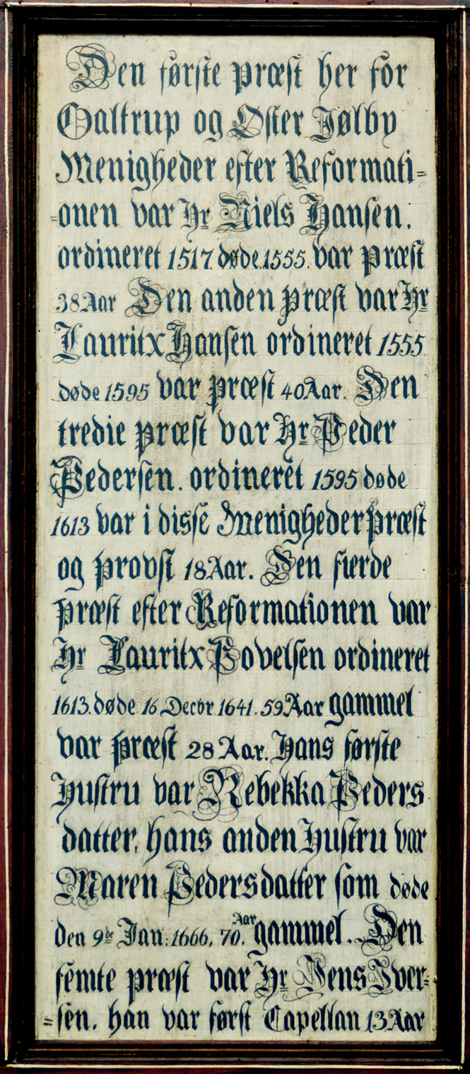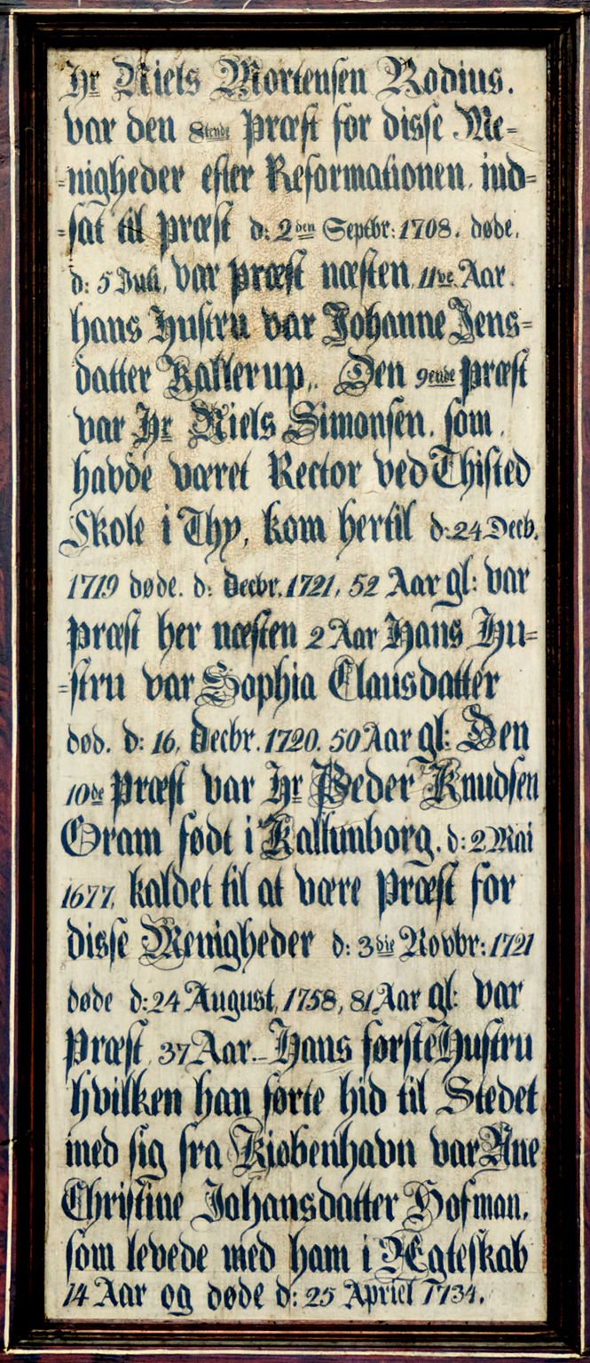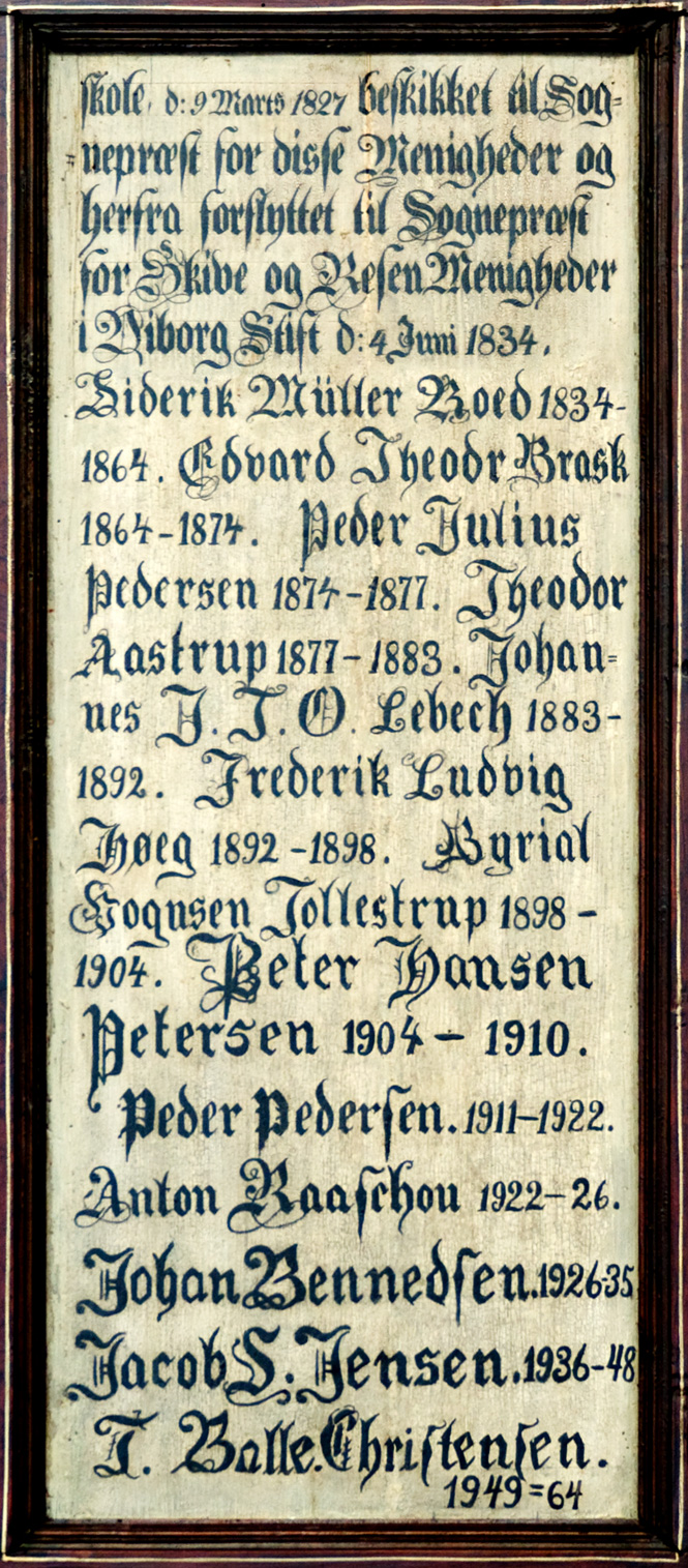 Præstetavle fra 1830'erne med senere a jour føringer. Der fortælles udførligt om præsterne. På rammen står der bl.a.: »Stat Læser her og see, See alle Præsterne, Som fra Lutheri Lære Har fødet Herrens Hjord.«
