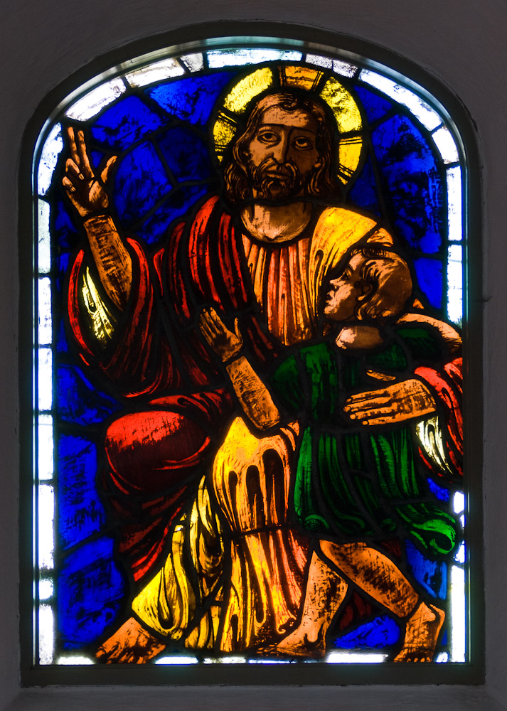 Glasmaleri af M. Trock: «Jesus velsigner de små børn«.