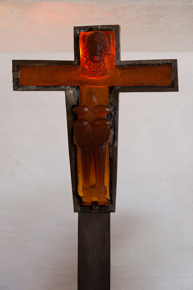 Krucifix udført af Niels Helledie. Krucifixet er oprindeligt udført i stentøj, men Niels Helledie har fået glaskunstneren Janusz Walentynowicz, Illinois, til at lave en afstøbning i glas. Det var oprindelig lavet til Aarestrup kirke, hvor det skulle stå foran et vindue. Da der ikke noget vindue umiddelbart bagved i Børglum kirke, har menighedsrådet anbragt et stearinlys i stedet for. Krucifixet er anbragt i en ramme af støbejern og står tillige på en støbejernplade. Krucifixet er lavet som en sikkerhedskopi, hvis der skulle ske noget med det undervejs fra USA til Aarestrup.