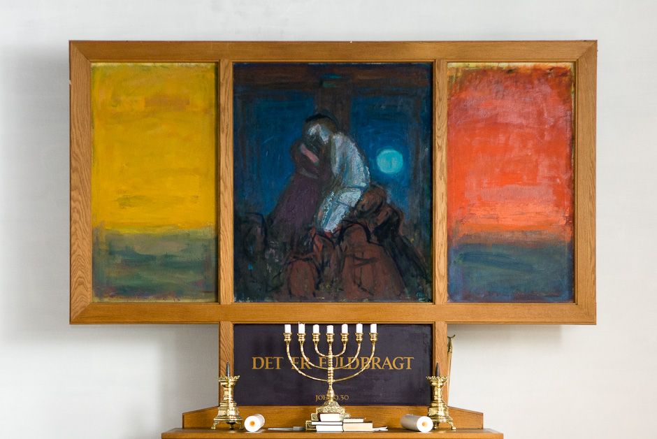 Altertavlen er udført af Svend Havsteen-Mikkelsen i 1965. Motivet er Korsnedtagelsen.