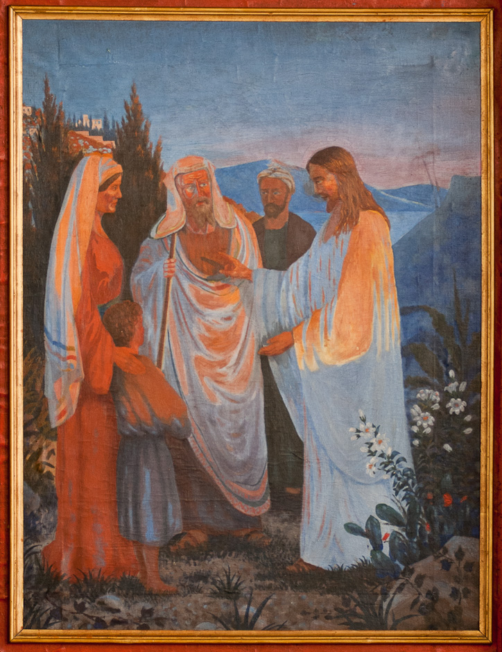 Alterbilledet er udført af E. Bayer i 1905: Jesus i samtale med to mænd og en kvinde.