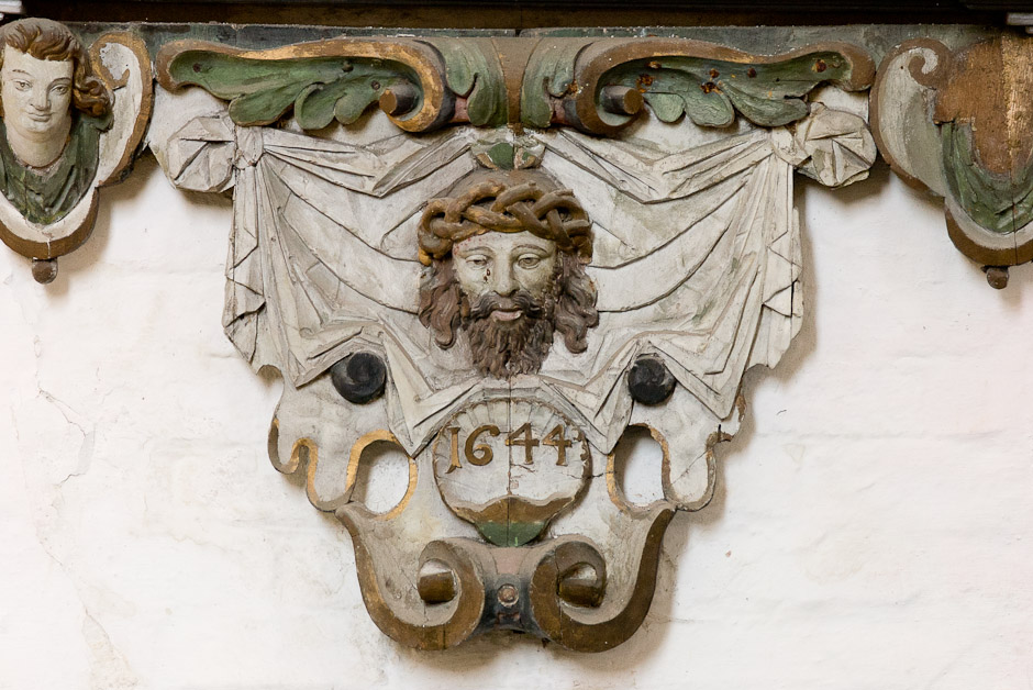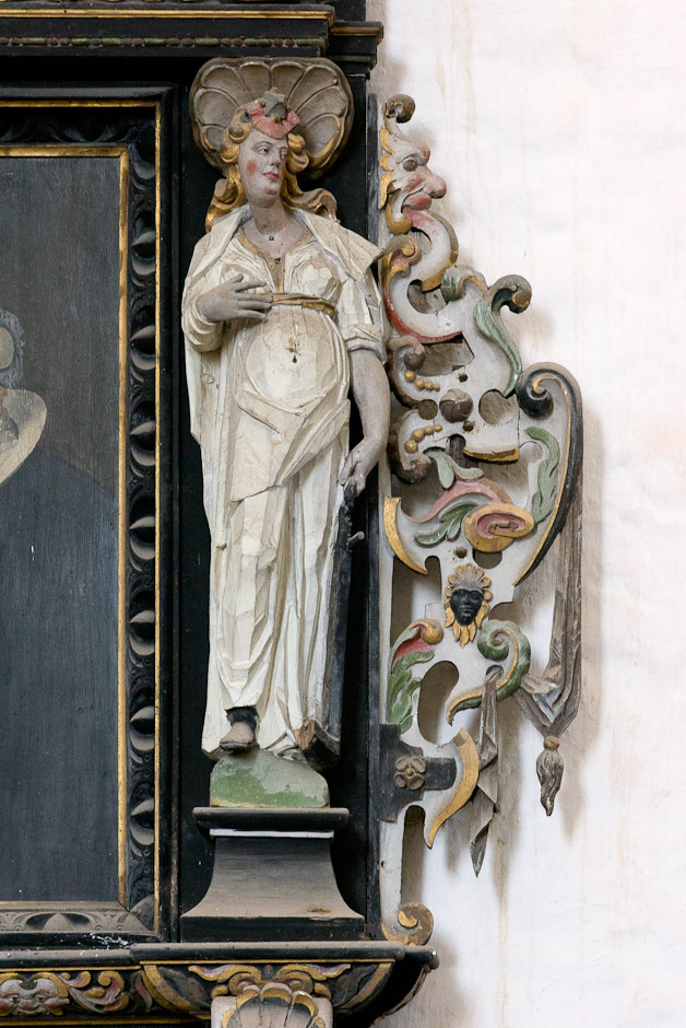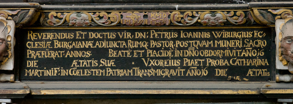 Paa den nederste nordre Pille, ind til Midt-Gangen, findes et Epitaphium, som daværende Sogne-Præst Hr. Niels Søffresen har ladet opsætte, hvorpaa staar tegnet: