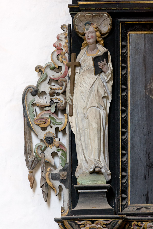 Epitafium på skibets nordvæg for kirkens sognepræst Peter Johannes Viborg og hustru Cathrina Mortensdatter. Teksten, der er på latin, har åbne pladser til indførelse af datoer og årstal. Epitafiet er udført i 1644 og skåret af Niels Jensen Billedsnider, der havde værksted i Aalborg. Da Niels Jensen Billedsnider døde i 1645, stod der et færdigt epitafium på hans værksted, som endnu ikke var leveret eller betalt. Det må have været dette epitafium. Det vides med sikkerhed, at han også har skåret døbetonten i Hvorup kirke. Se Viggo Petersen: Aalborghåndværk i Nordjylland, s. 84ff.