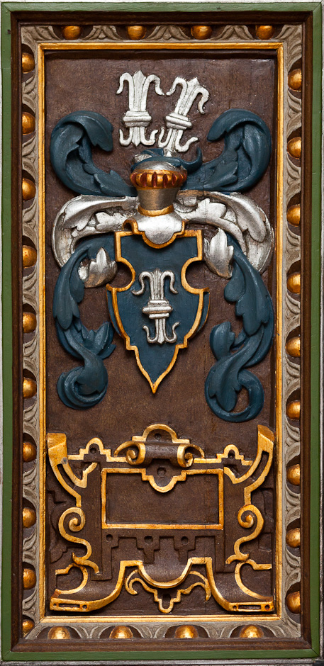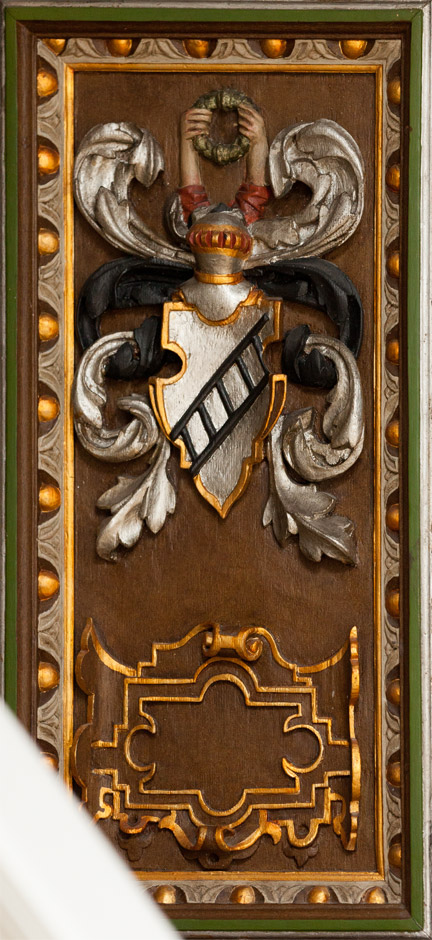 De nederste smalfelter oplyser, at stolen er skænket af Christoffer Michelsen Tornekrans og Dorte Juuel 1588. En indskrift nedenunder oplyser, at stolen er stafferet i 1744.