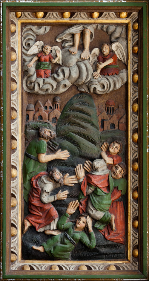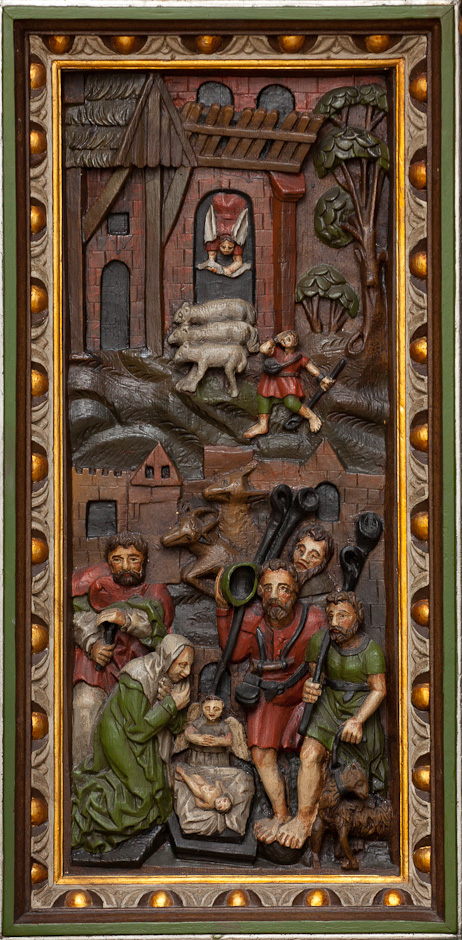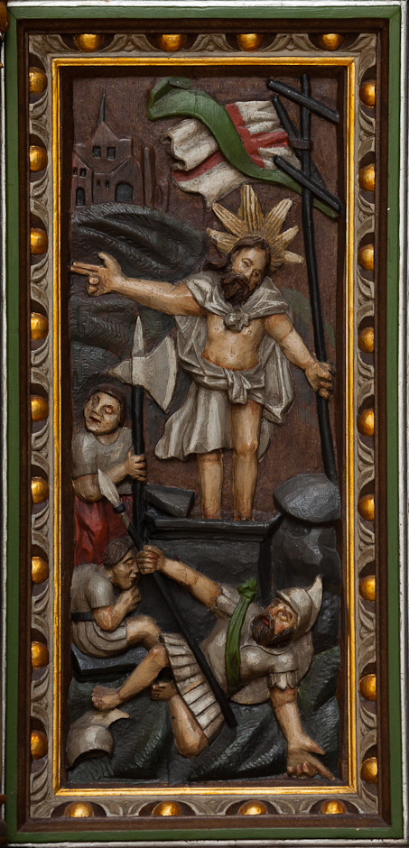 Motiverne i storfelterne er Jesu fødsel, våbenskjold for Tornekrans, Kristus på korset, våbenskjold for Juul, Opstandelsen og Himmelfarten.