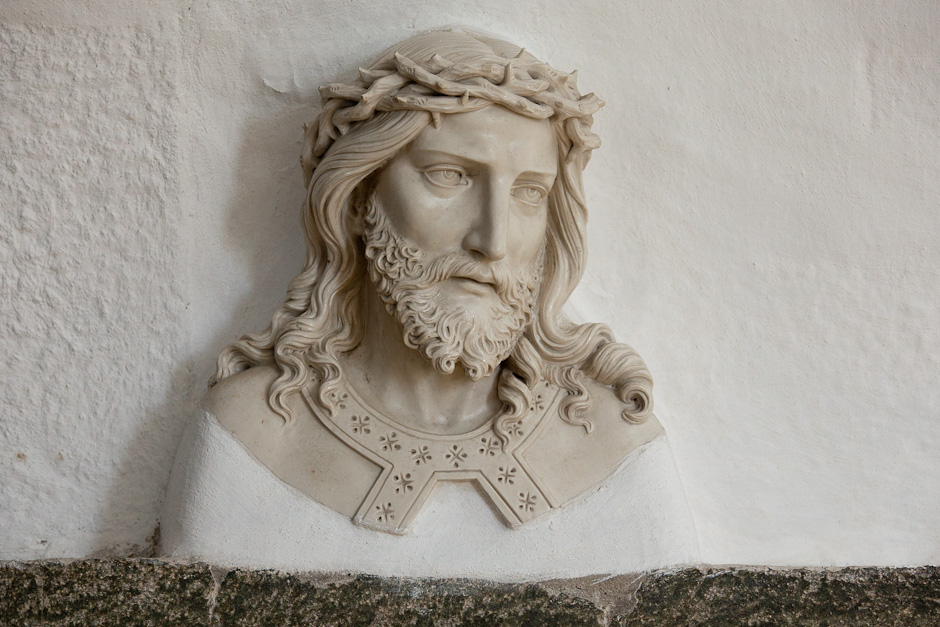 Kristus med tornekrone. Korbue over kragsten i nordside.
