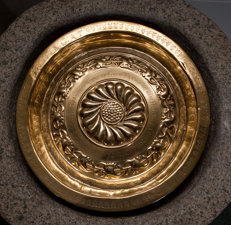 Indskriften fortæller, at fadet er skænket til kirken i 1863 af grev Tram og hustru comtesse Ahlefeldt Laurvigen.