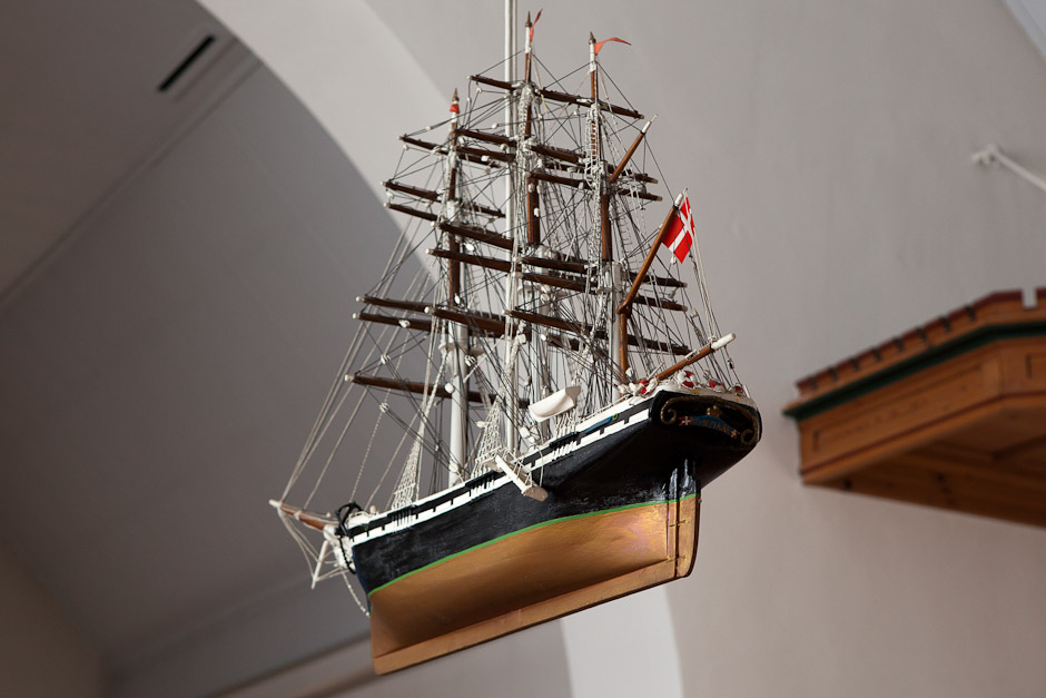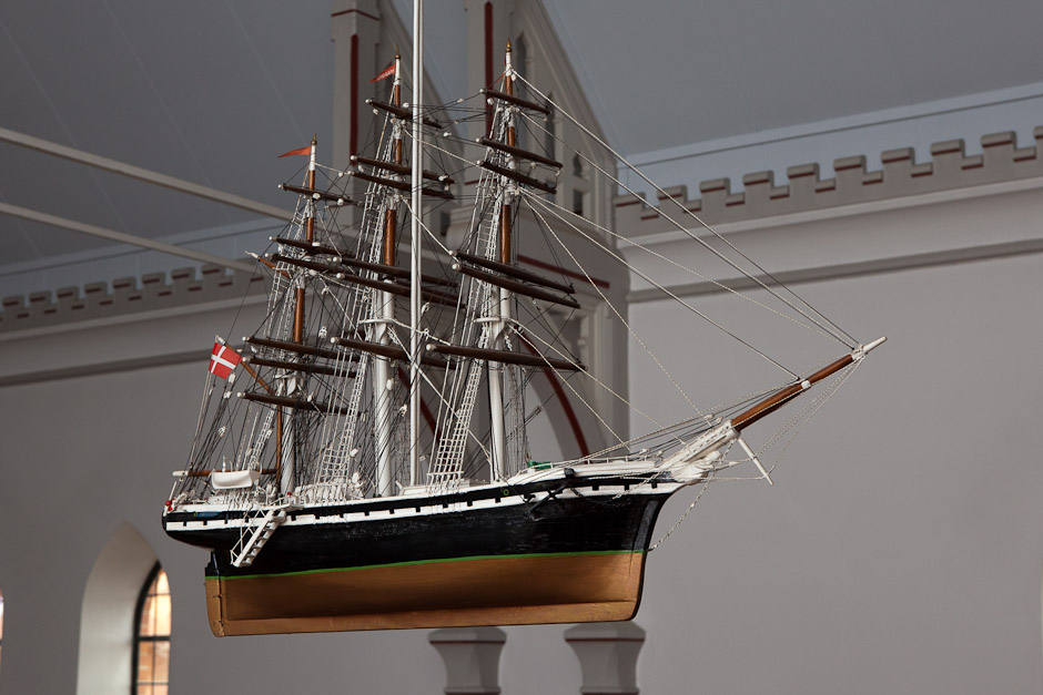 »Danmark« er et 3-mastet fuldskib, koffardiskib, bygget i 1930 af forhenværende skibsfører og lods P.C. Bast, Frederikshavn. Det er ophængt i kirken samme år.