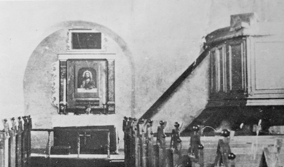 Kirkens indre. Årstallet for billedet kendes desværre ikke, men et gæt er o. 1900. Alterbilledet hænger i dag på væggen i skibet i den nye kirke.