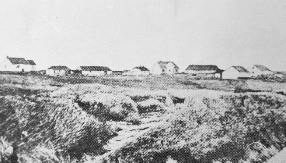 Lyngby gamle kirke ses længst til venstre på dette foto fra o. 1900. Den lange bygning - nr. 2 til højre for kirken - er kirkestalden, der senere blev indrettet til fiskernes frysehus.
