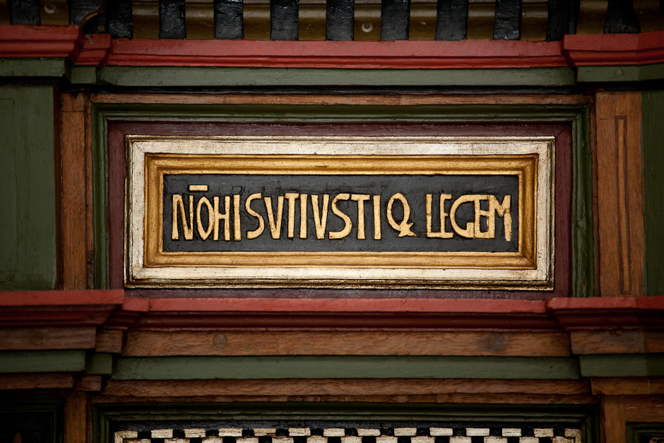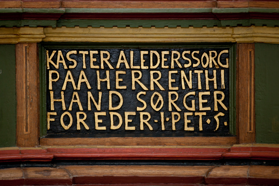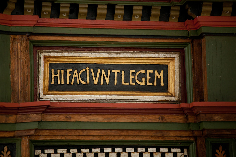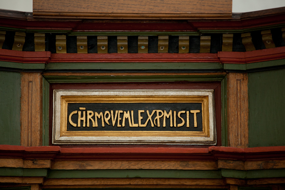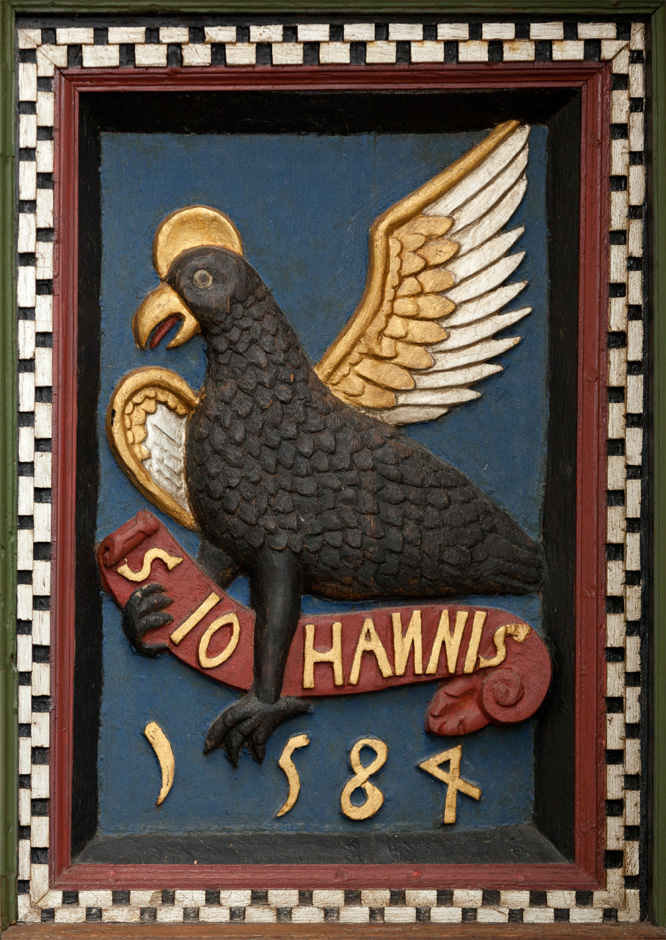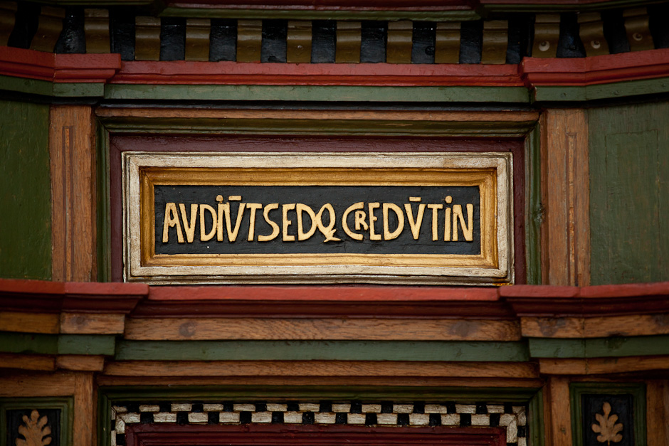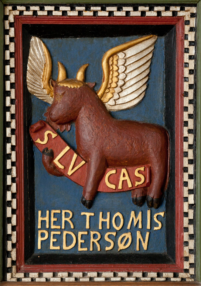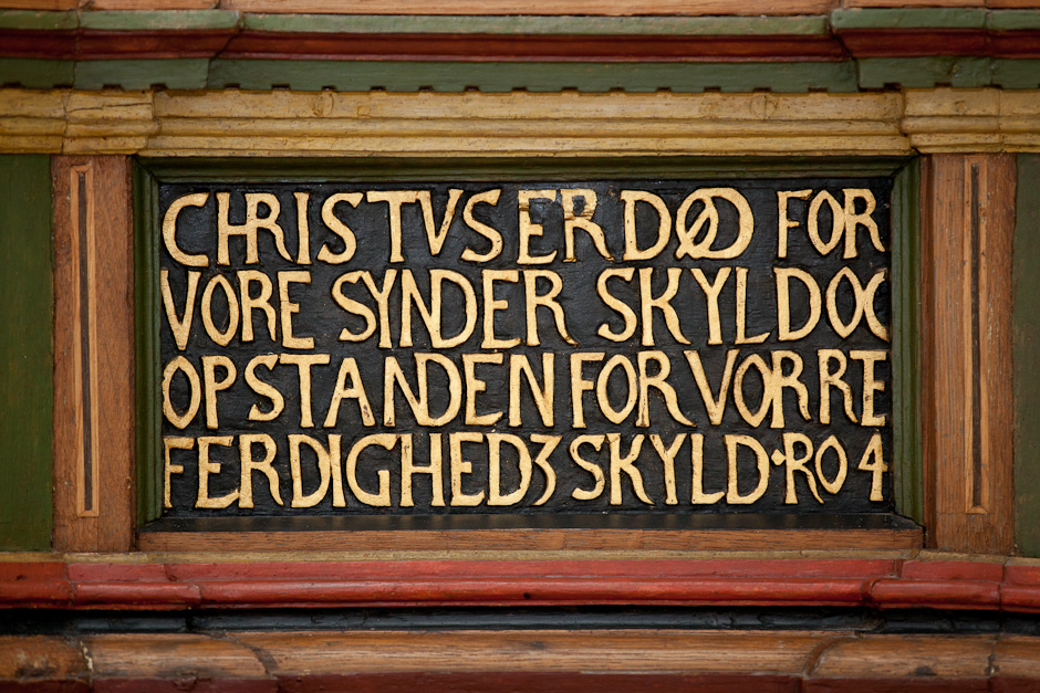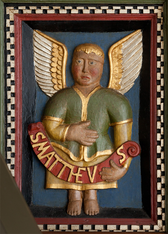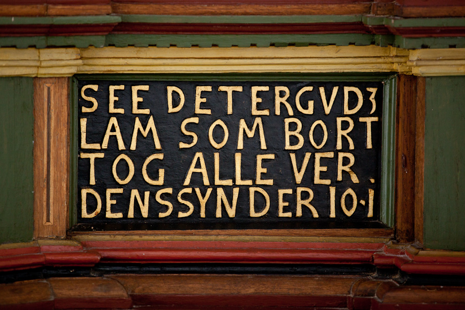 Prædikestolen har fire fag. Den bærer præsten Hr. Thomis Pedersøns navn samt årstallet 1584.