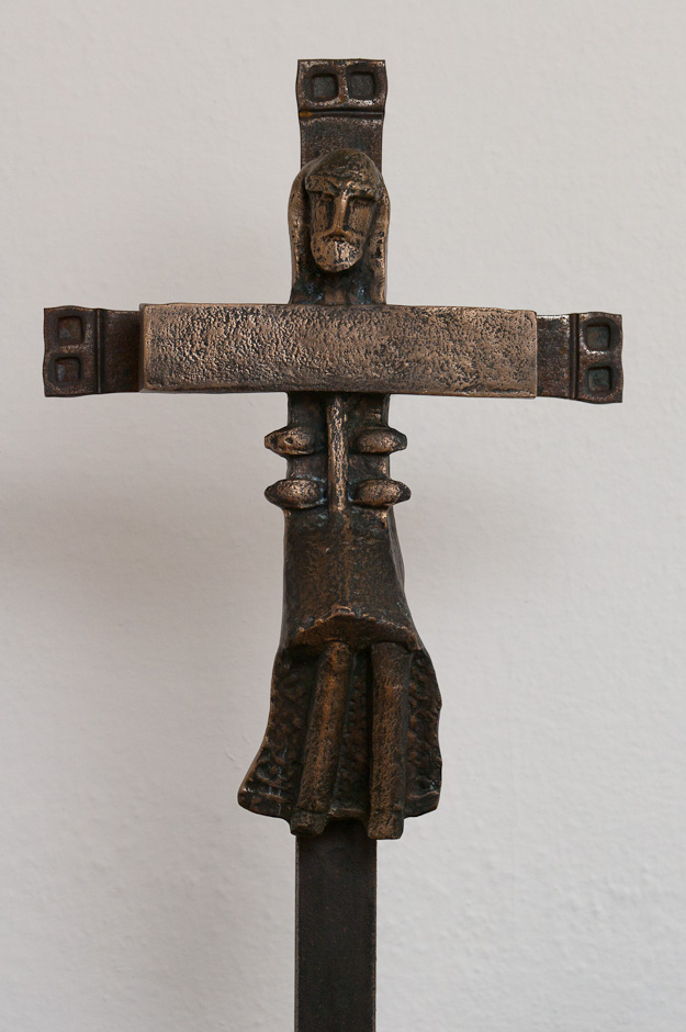 Krucifixet er udført i jern og bronze af Niels Helledie. Det blev skænket til kirken i 2008.