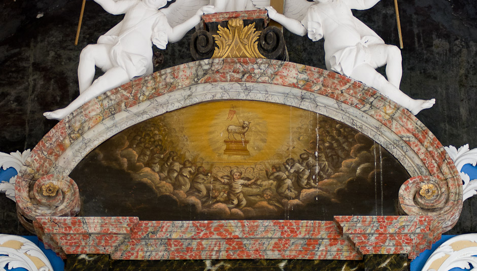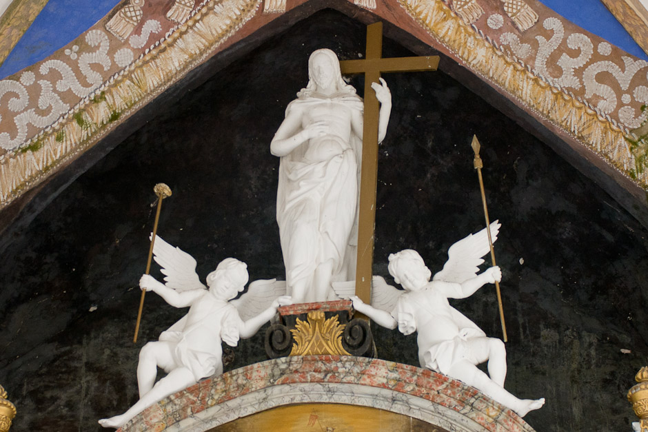Den opstandne med kors flankeret af to engle med henholdsvis svamp og spyd, to af de ting, der blev anvendt til pinslerne.