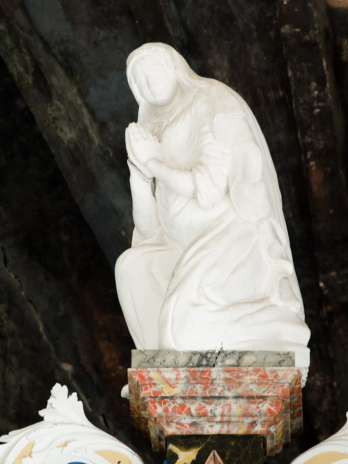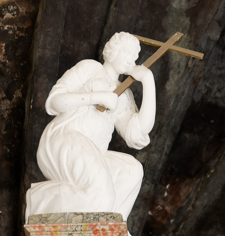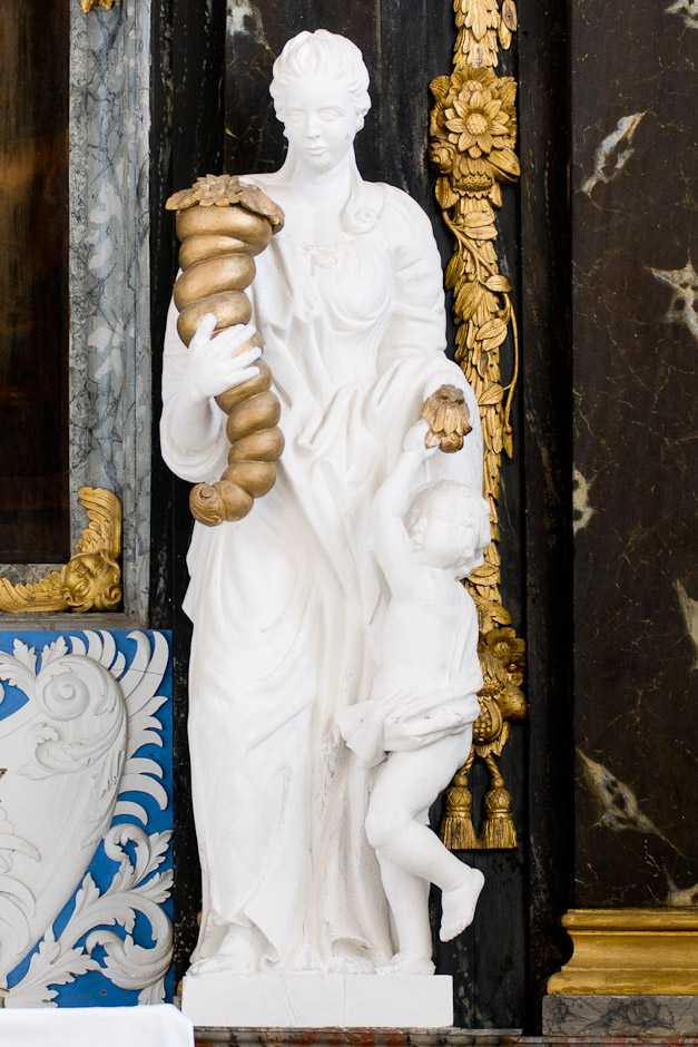 De to store kvindefigurer med børn og overflødighedshorn på hver side af alterbordet er symboler på kærligheden. Troen og håbet fremstilles af de to kvindefigurer, der knæler oven på de to trekantfelter - den ene med et kors og den anden med hænderne samlet i bøn.