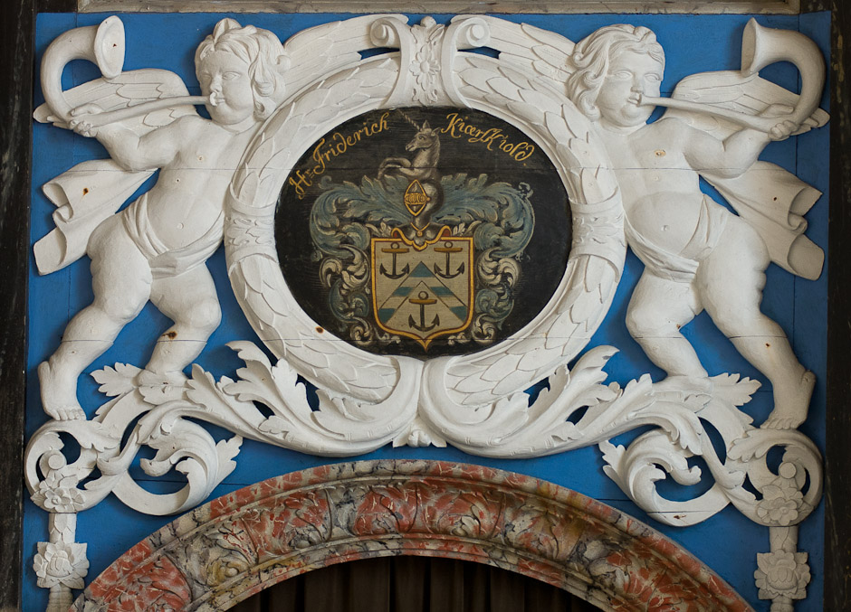 Altertavlen, der er næsten 12 m høj, er bekostet af kirkens ejer, Frederik Kjærskjold. Stilmæssigt er den sammensat af arkitektoniske elementer tilføjet et væld af akantusblade. 6 høje pilastre bærer hovedgesimsen, der er smykket med guirlander. Mellem de to yderste pilastre mod henholdsvis nord og syd er der indgang til rummet bagved.