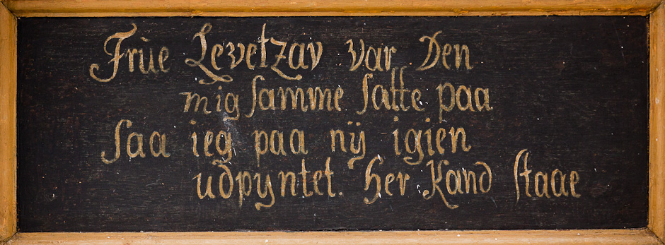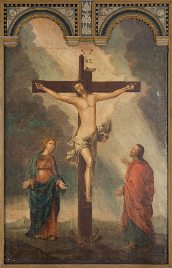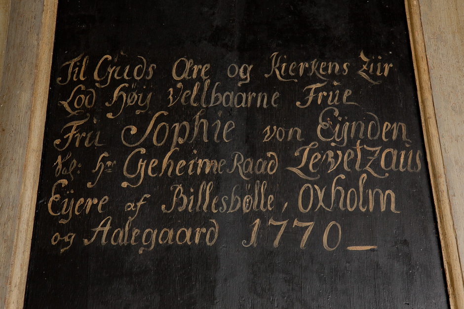Billedet af Kristus på korset stammer fra 1770. Billedet med den dertil hørende staffering er skænket af »højvelbårne frue, fru Sophie von Eynden, salig hr. geheimeråd Levetzaus, ejere af Billesbølle, Oxholm og Aalegaard,« som det fremgår af indskriften på tavlens bagside.