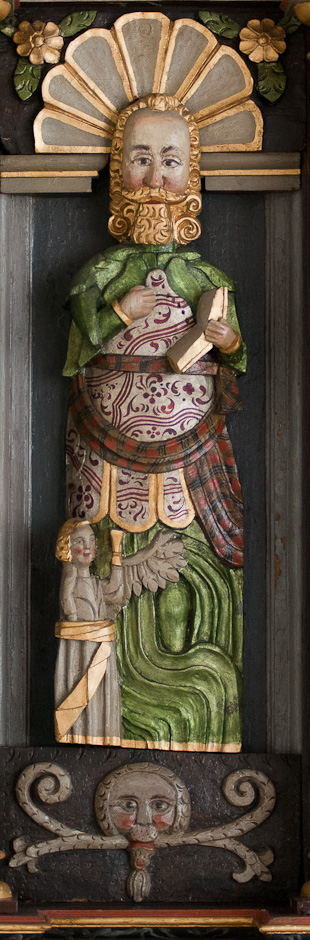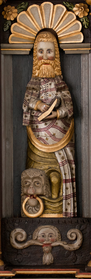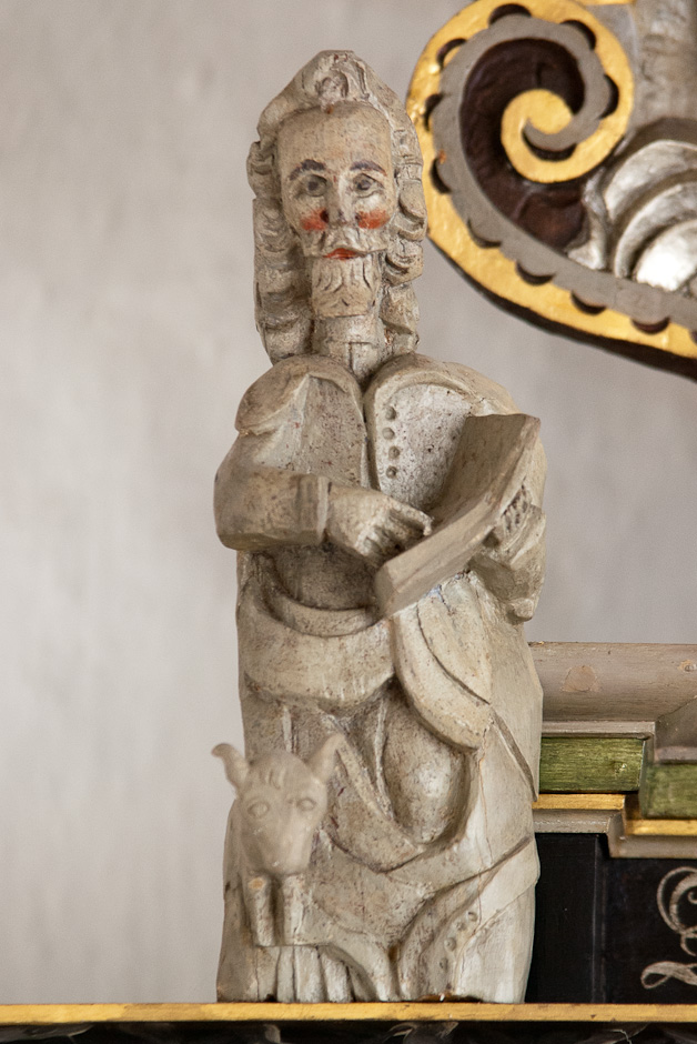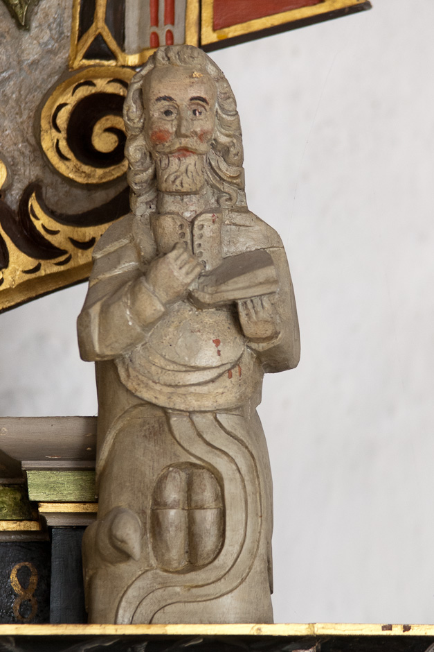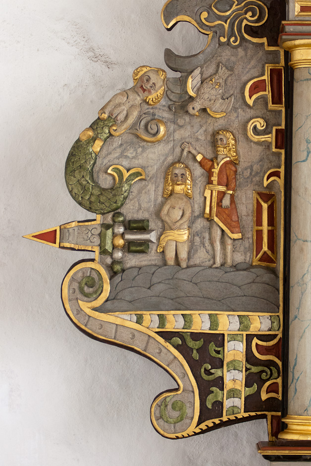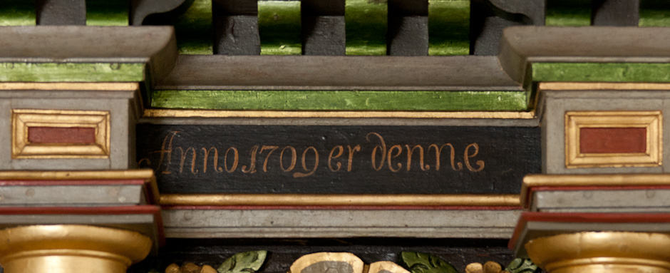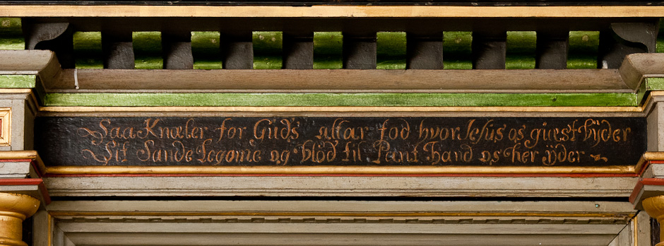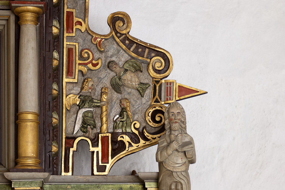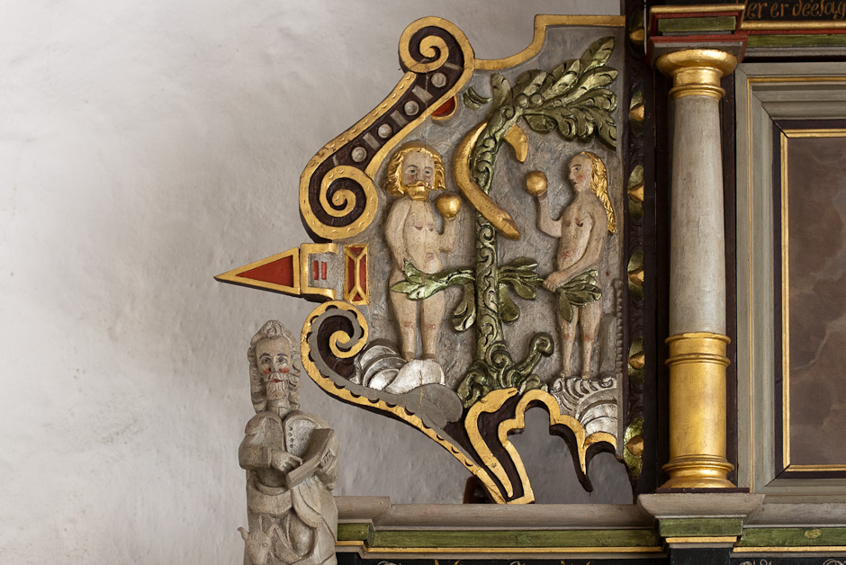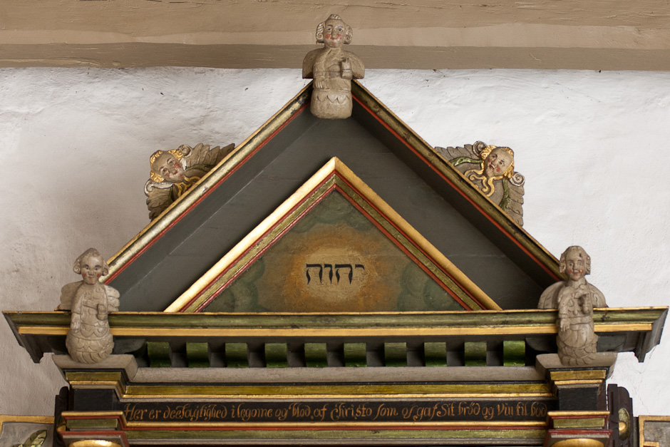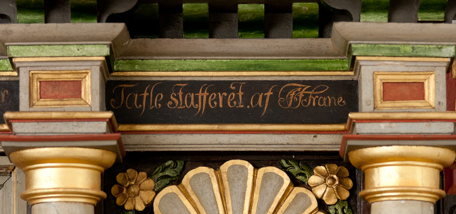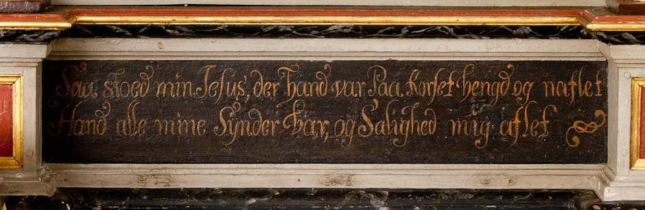 En maler fra Thisted fik i 1619 betaling for at staffere altertavlen. I 1709 stafferede Jens Thrane både altertavle og prædikestol. Se storgesimsen. Rimene stammer fra Thranes hånd: