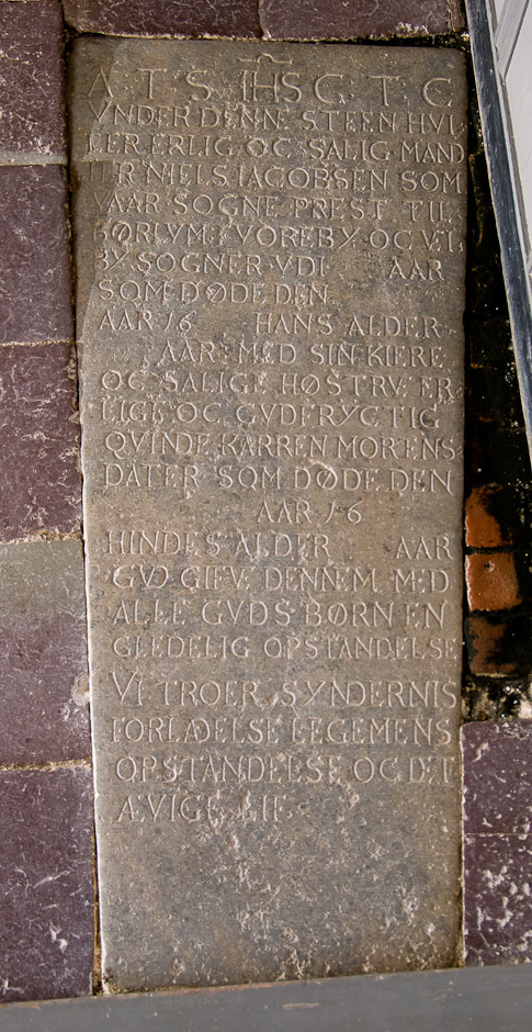 Niels Jacobsen var sognepræst i Børglum i 1600-tallet. Stenen ligger i gulvet i koret.