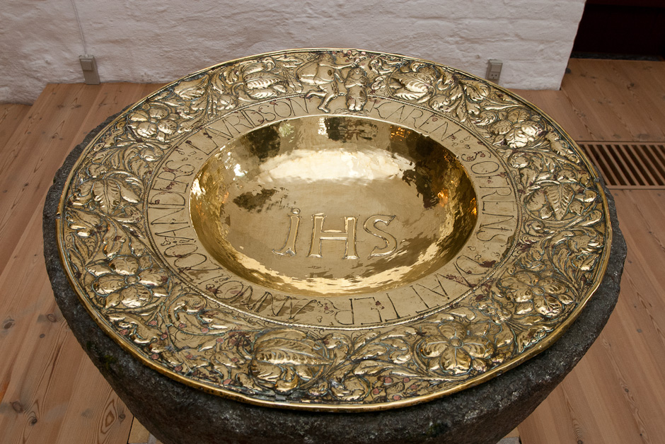 I bunden af dåbsfadet ses bogstaverne IHS (Jesus Hominum Salvator - Jesus menneskenes frelser). Foroven en simpel fremstilling af Johannes, der er i færd med at døbe Jesus. På fadets rand står der: »Anders Lavridsøn Karen Søfrensdaatter Anno 1700«. Anders Lauridsen drev blandt meget andet en købmandshandel i byen.