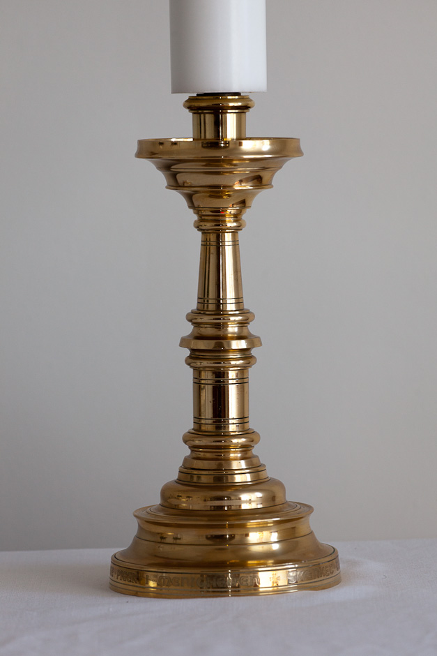 En indskrift på foden af alterstagerne fortæller, at de er skænket af unge piger i sognet.
