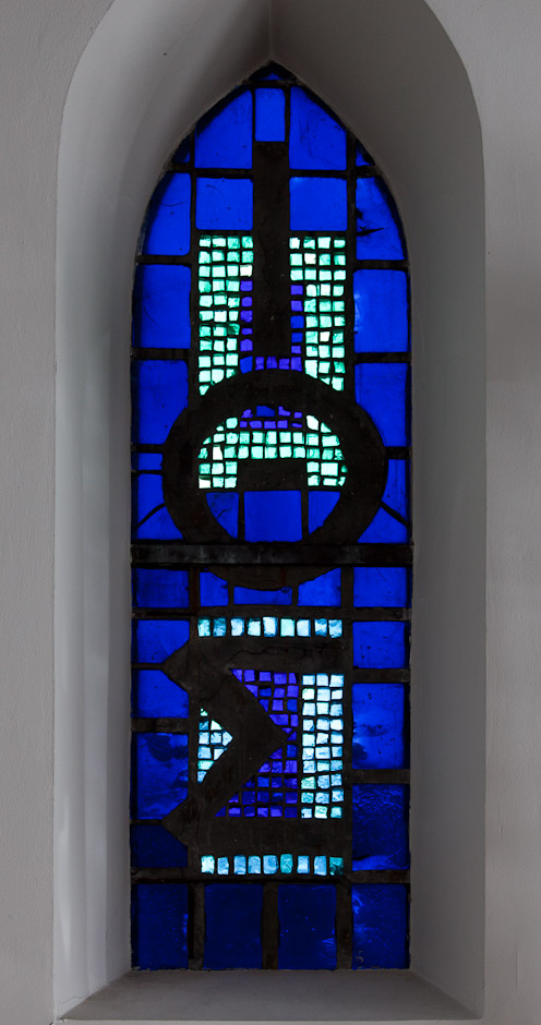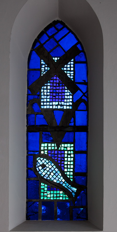 Mosaikruderne i korets tre østvinduer er indsat samtidig med kirkens restaurering i 1960-61. De er skabt af kunstneren Palle Bruun, der også har lavet en mosaikrude til Sørig kirke. Den midterste i røde farver er tænkt som indramning af krucifixet over alteret, medens de to yderste ruder er holdt i blå nuancer, og her ses de græske bogstaver for IKTYS, som betyder fisk på græsk, og en stiliseret fisk. Fisken var de første kristnes tegn.