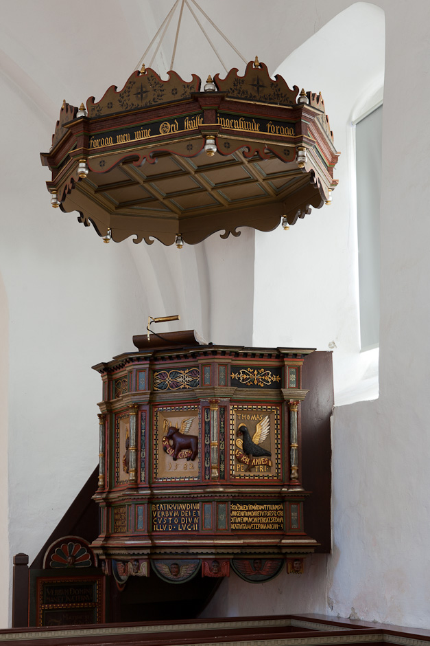 Prædikestolen er fra 1582. Den bærer præsten Thomas Pedersens navn. Det findes i storfeltet med evangelisten Johannes' ørn. Den har fem fag. De øverste smalfelter er udsmykket med ornamentik. De nederste smalfelter har skriftsteder på latin svarende til evangelisten i storfelterne ovenfor. Fagene adskilles af en tynd søjle med kanelyrer, der er delt lidt under midten, og korintiske kapitæler. Hængestykket under første fag er en palmet med et menneskehoved, mens der er engle på hængestykkerne under de øvrige fag og under postamentfremspringene.