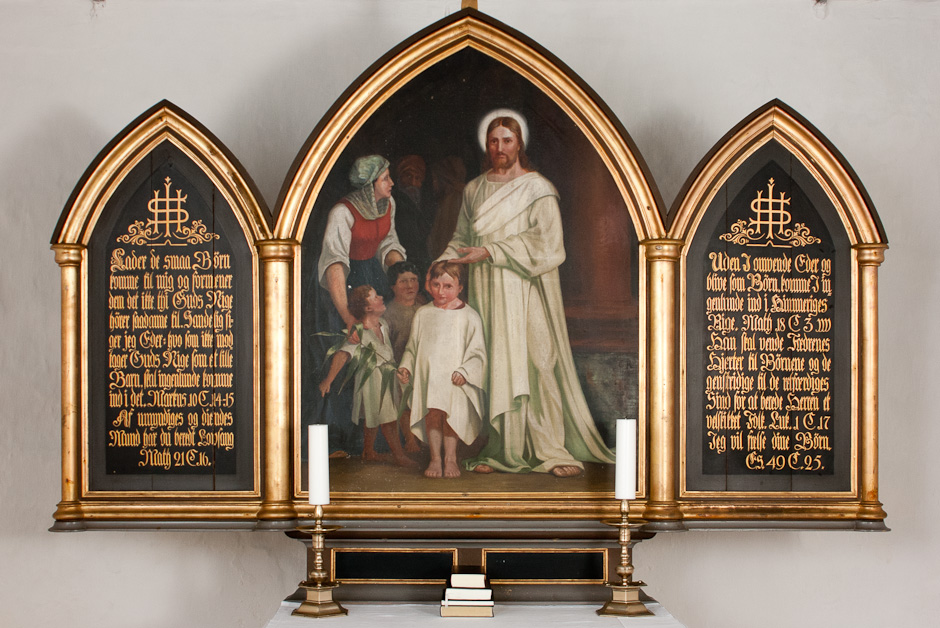 Altertavlen er lavet i nygotisk stil. Billedet fra 1867 er udført af E. Holm, Thisted. Motivet er »Lader de smaa Børn komme til mig«.