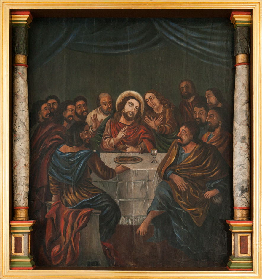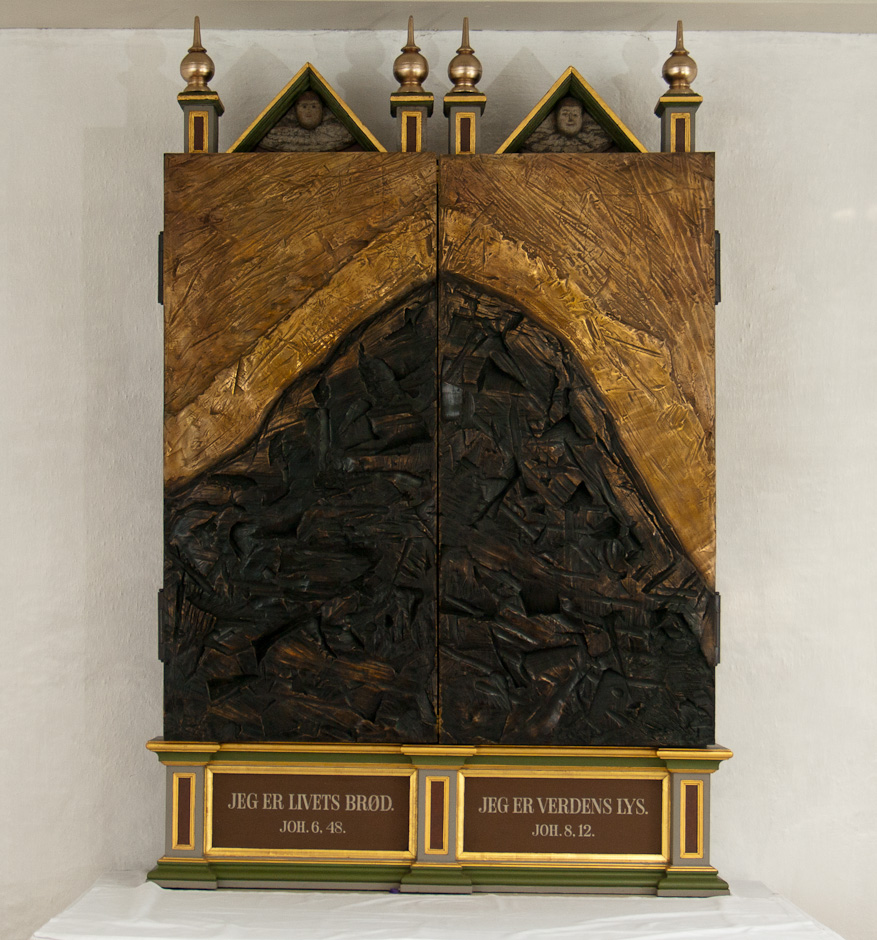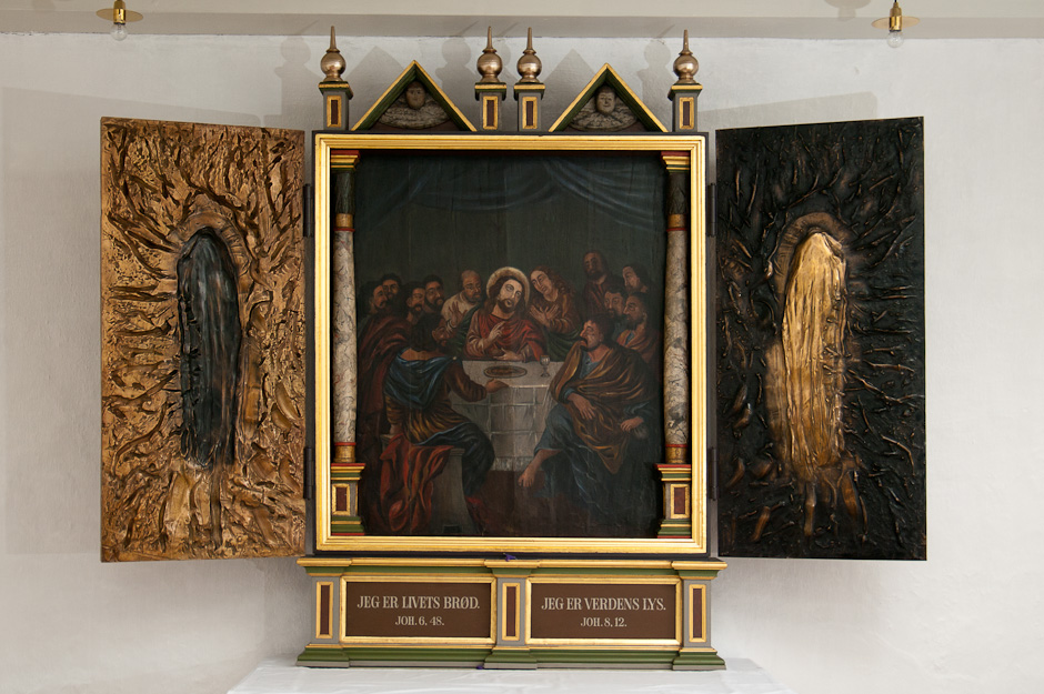 Midterskabet er fra en lutheransk fløjaltertavle fra 1580-90. Søjlerne, der står inde i rammen har buede skafter og kapitæler med blade. Den har to trekantgavle med englehoveder og fire spir. Nadverbilledet er udført af Jens Thrane i 1710. Det blev kraftigt opmalet omkring 1850, men ved en istandsættelse i 1933 blev Thanes oprindelige staffering genskabt. Det gælder også marmoreringen på søjleskafterne. Ved samme lejlighed blev der tilføjet to sidefløje - også de med spir og trekantgavle. Se billedserien af, hvordan kirken så ud før restaureringen.
